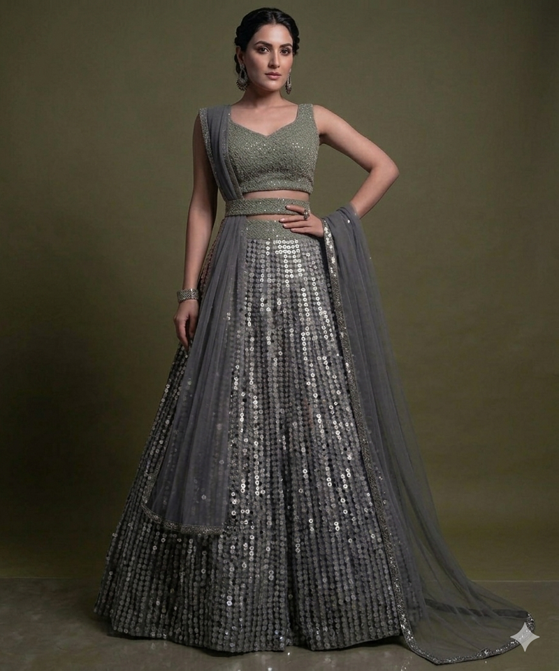 Elegant grey heavy sequin embroidered a-line lehenga with sweetheart neck blouse