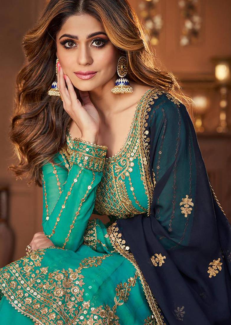 | Product Name | Georgette Party Wear Sharara In Turquoise Color With Embroidery Work | |