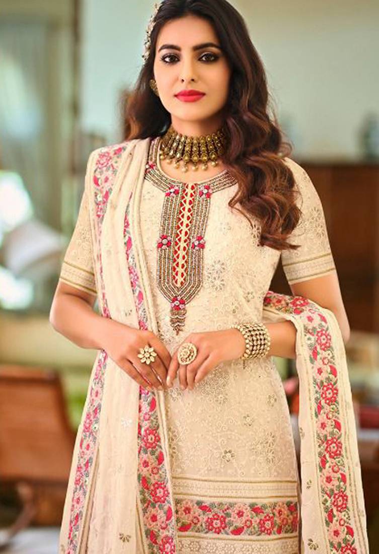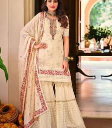 Pure georgette party wear sharara in off white color with embroidery work semi stitched