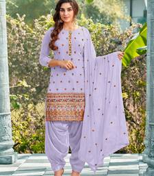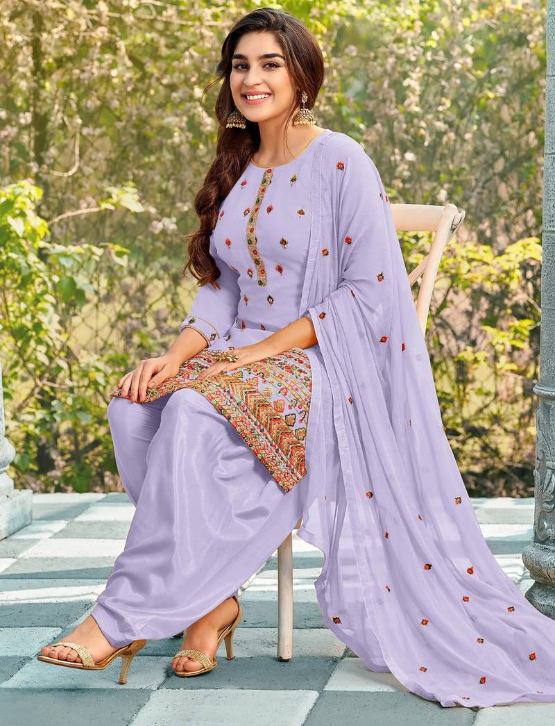 Pure georgette party wear suit in lavender color with embroidery work semi stitched
