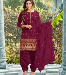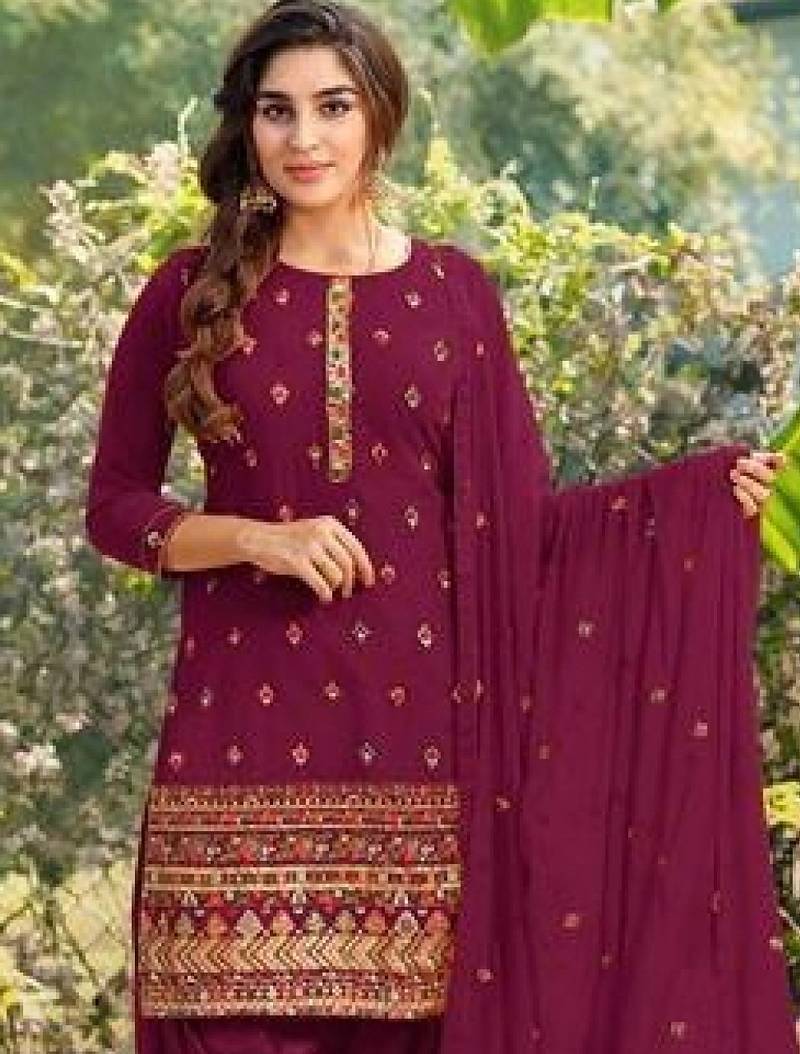 Pure georgette party wear suit in maroon color with embroidery work semi stitched