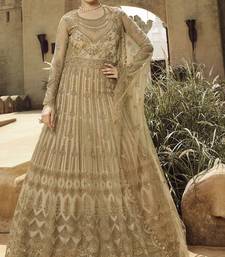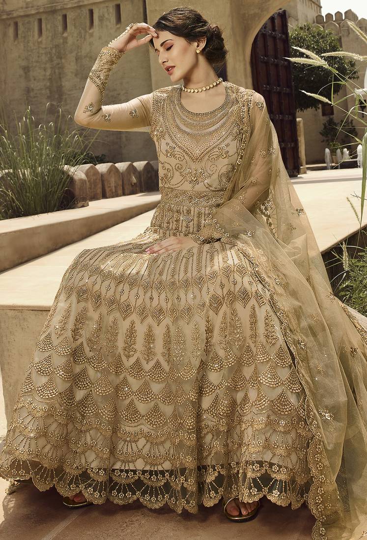 Soft premium net wedding wear gown in golden with embroidery & stone work semi stitched