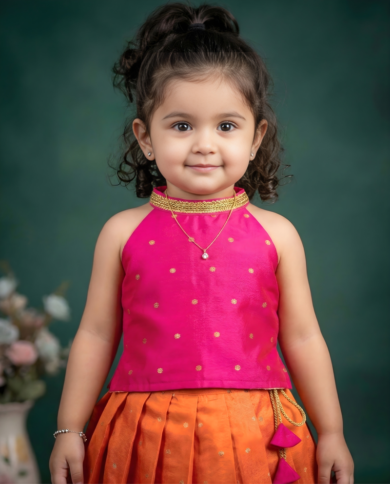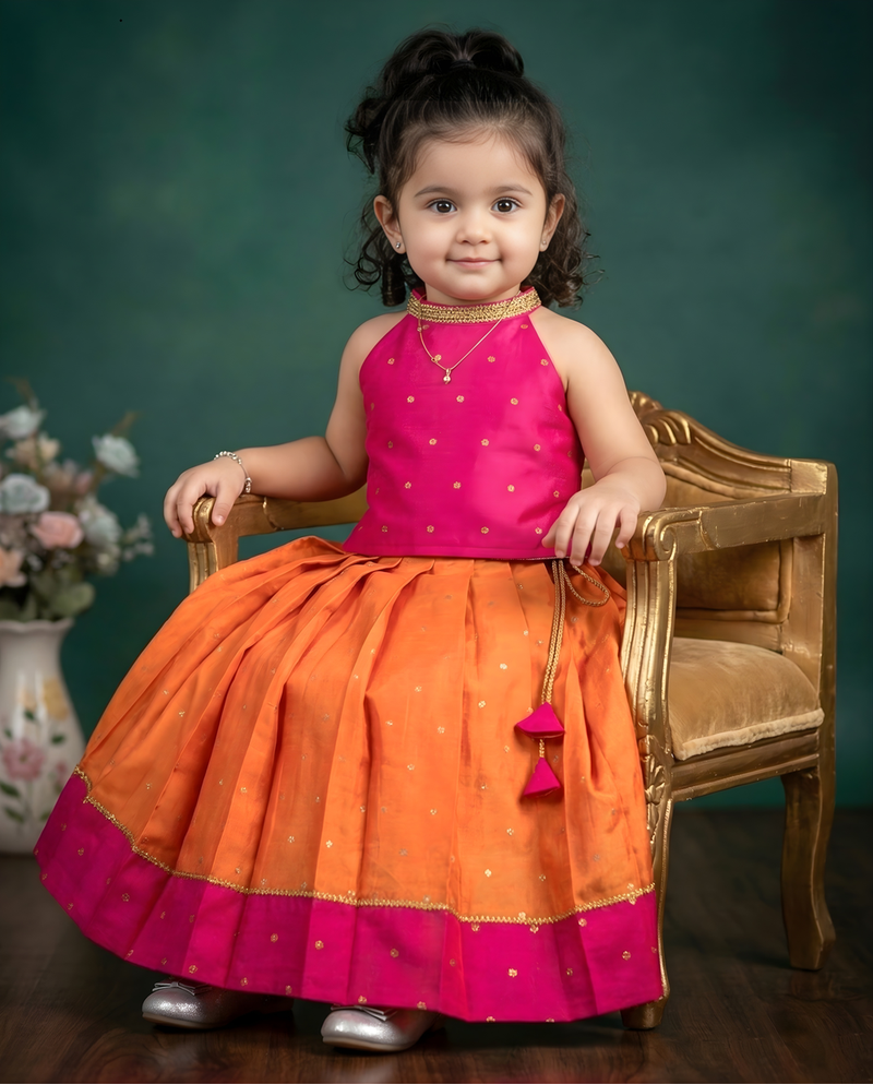 | Product Name | Baby Girls Fleared Pattern Dress Sleevless Readymade Ethnic Traditional Lehnga Choli Set Orange&Pink | |