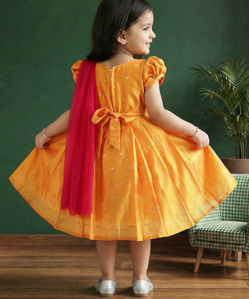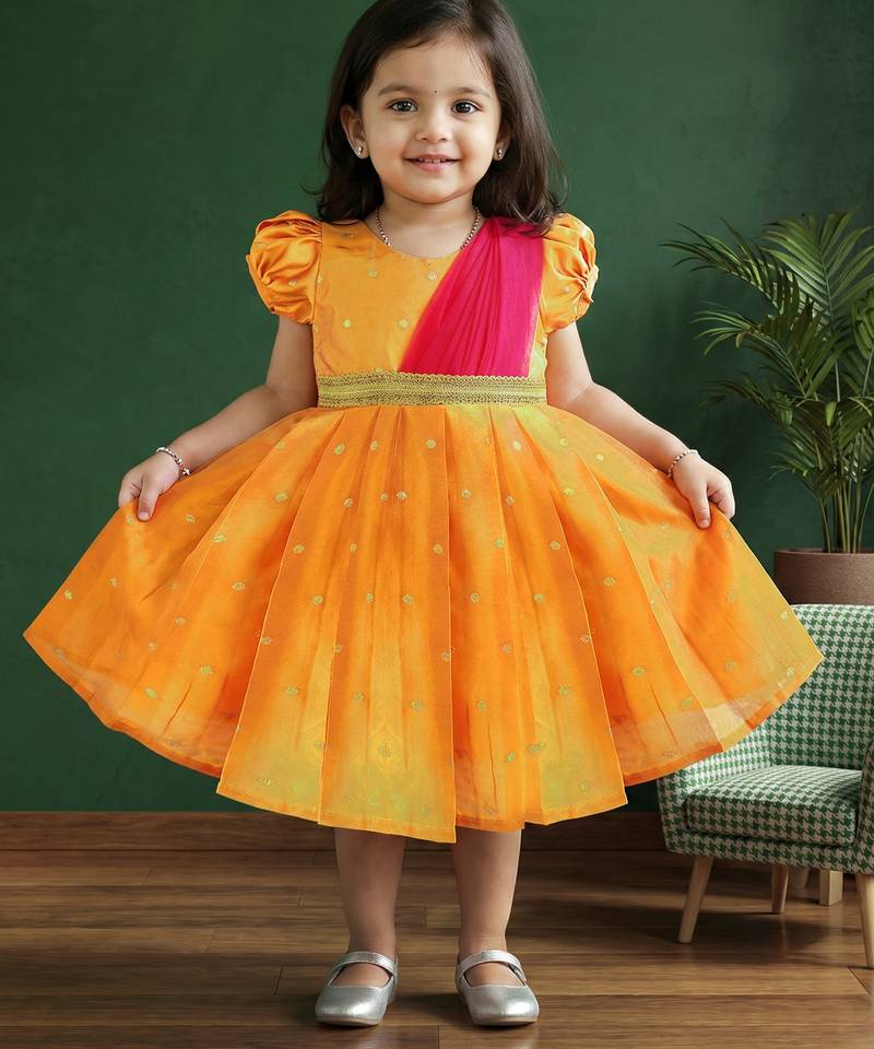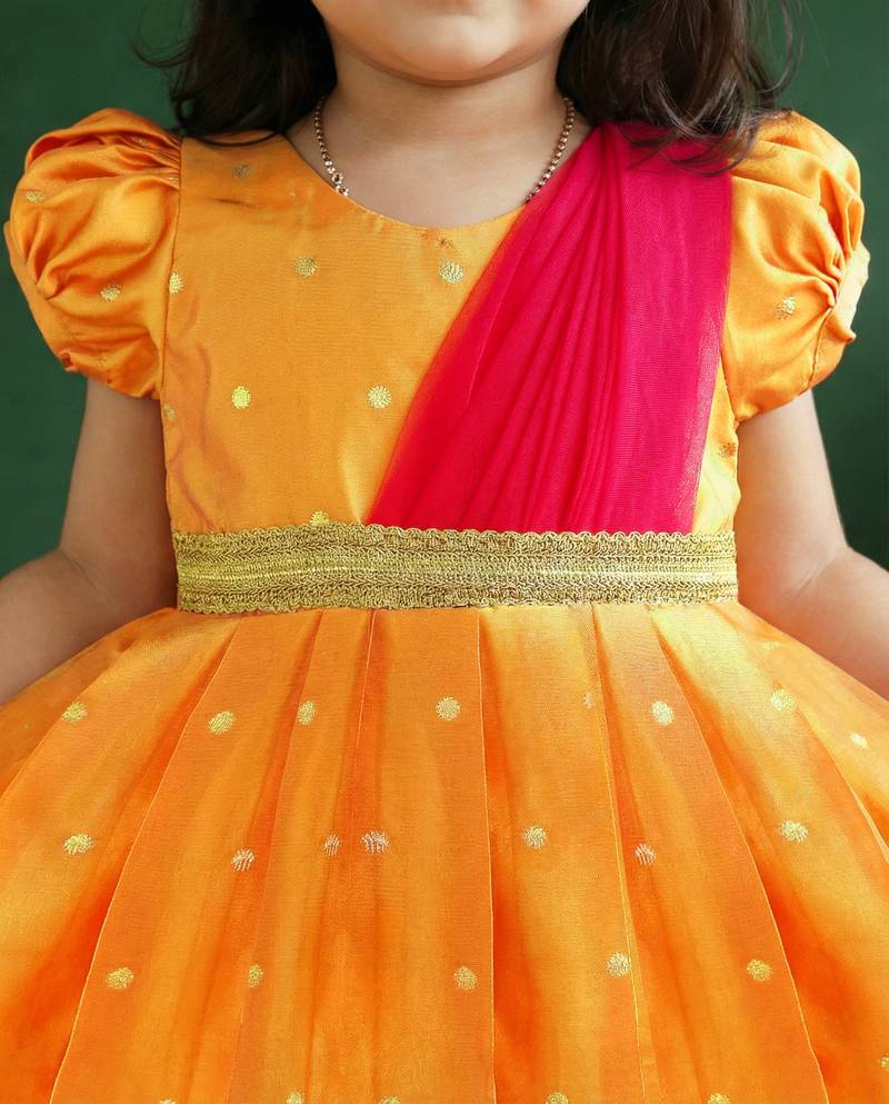| Product Name | Girls Yellow & Pink Silk Saree Frock | Traditional South Indian Pattu Partywear Dress | Festive Function Wear | |