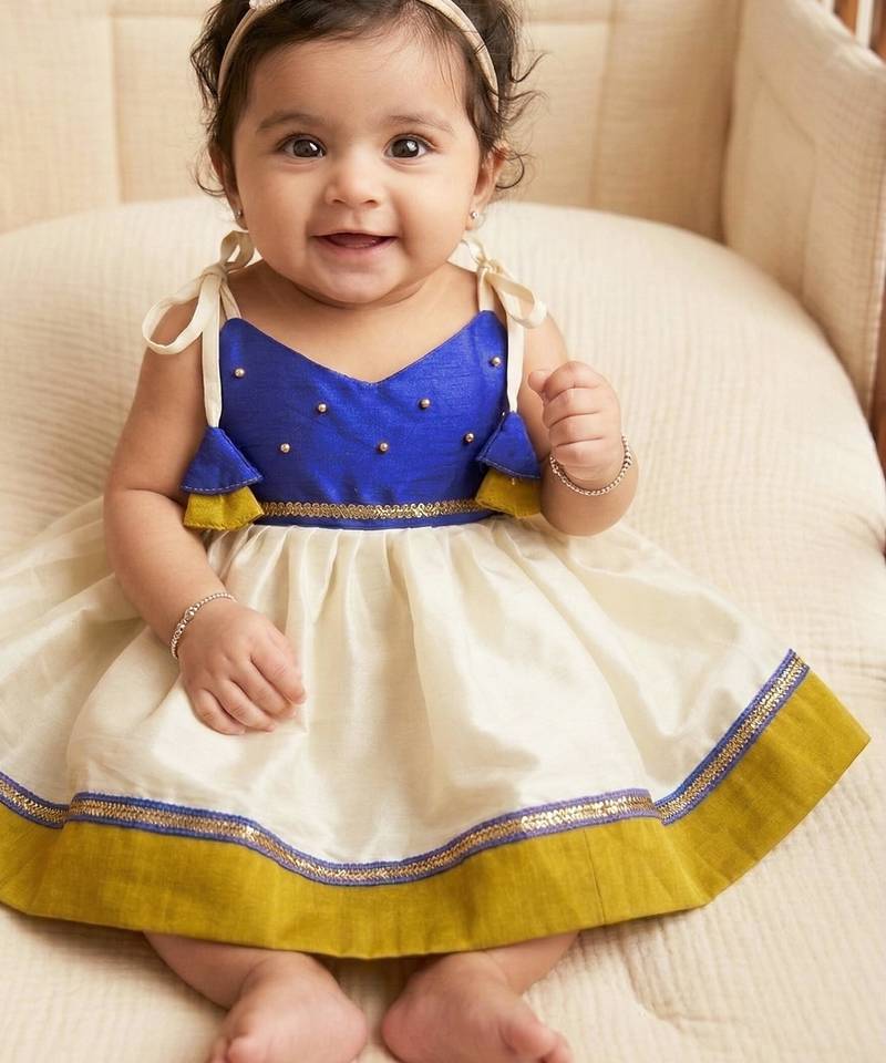 Kids newborn babygirl silk frock::Diwali dress::Ethnicwear::Festive indianwear cream&blue