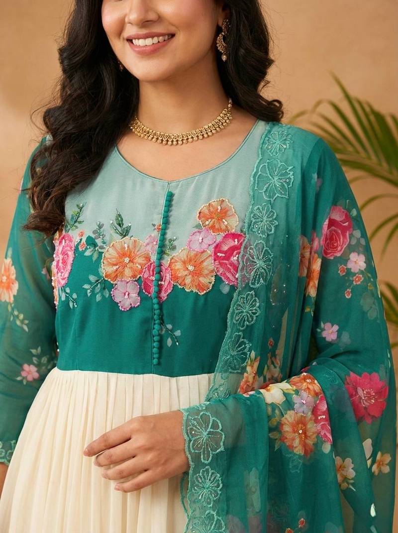 Gown Febrics Fox Georgette Heavy Quality Fabric With Handwork Neck And Sleeve ,Full Long With Creap Pant , Taby Silk Digital Print Dupatta With Embroidery Sequence Work Broder