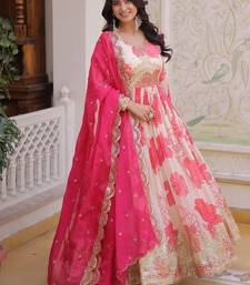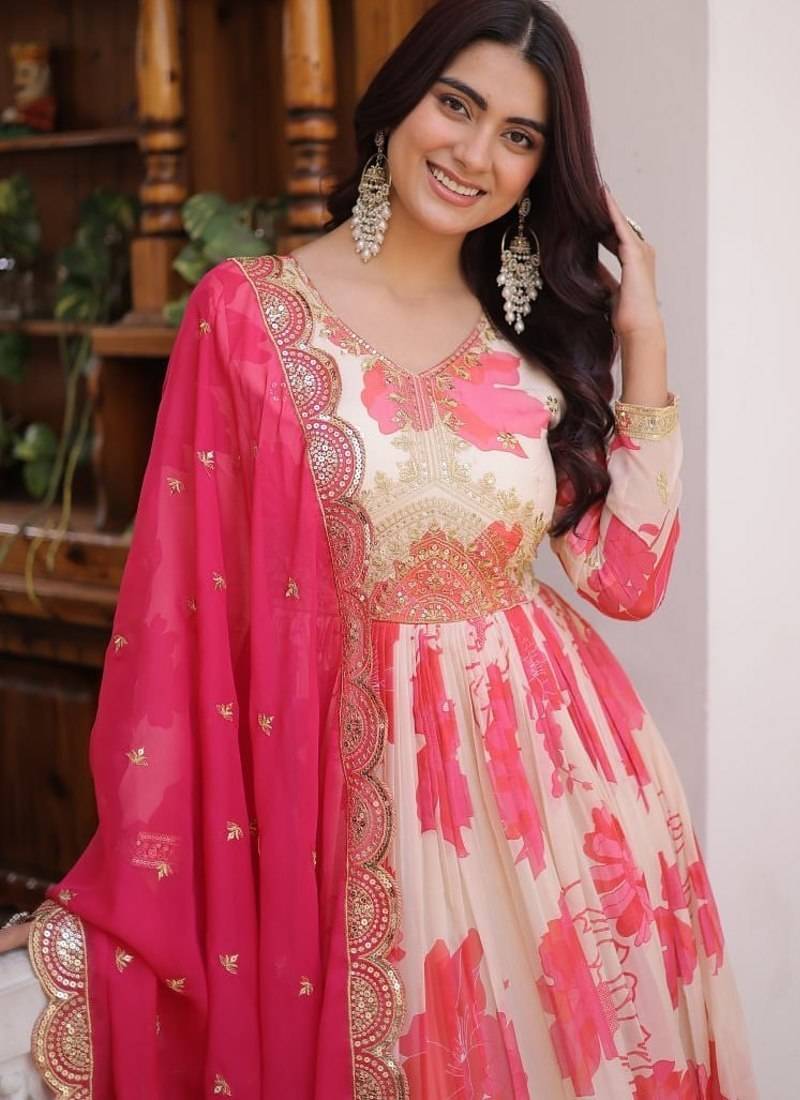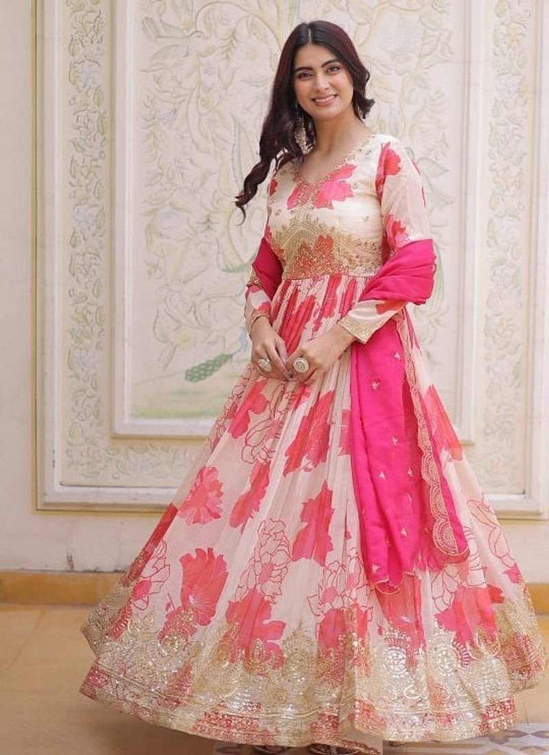 Product Name Womens New Trending Digital Printed Russian Silk With Embroidery Zari Sequins Work Gown Set