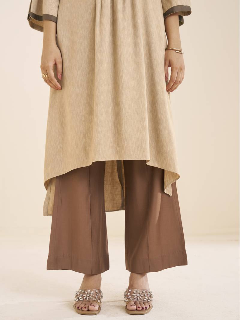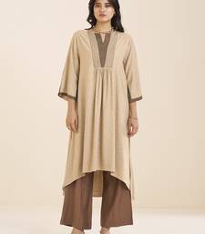 | Product Description | Add A Refined Touch To Your Everyday Style With This Beige Viscose Blend Kurta, Designed With A V Neck, Soft Fabric, And Pleat Detailing For A Clean And Modern Look. Crafted From A Viscose Blend, The Kurta Feels Smooth And Lightweight, Making It Comfortable For Long Hours. The Rich Beige Tone Creates A Strong Base, While The Contrast Detailing On The Neckline And Sleeves Adds A Subtle Highlight Without Making The Design Look Heavy. The Pleats On The Front Enhance The Overall Flow And Give A Structured Yet Relaxed Finish. The Silhouette Features A Slightly Flared And Asymmetric Hemline, Offering Ease Of Movement And A Stylish Edge. The Fabric Drapes Well, Giving A Neat And Graceful Fall That Works Well For Daily Styling. A Great Choice For Workwear, Casual Outings, And Day To Day Wear, This Kurta Pairs Easily With Pants Or Palazzos For A Simple And Well Balanced Outfit. |
