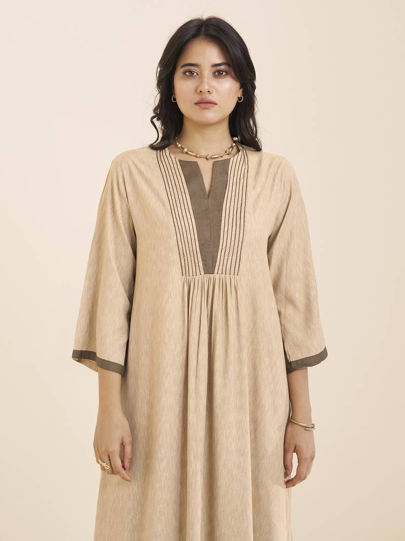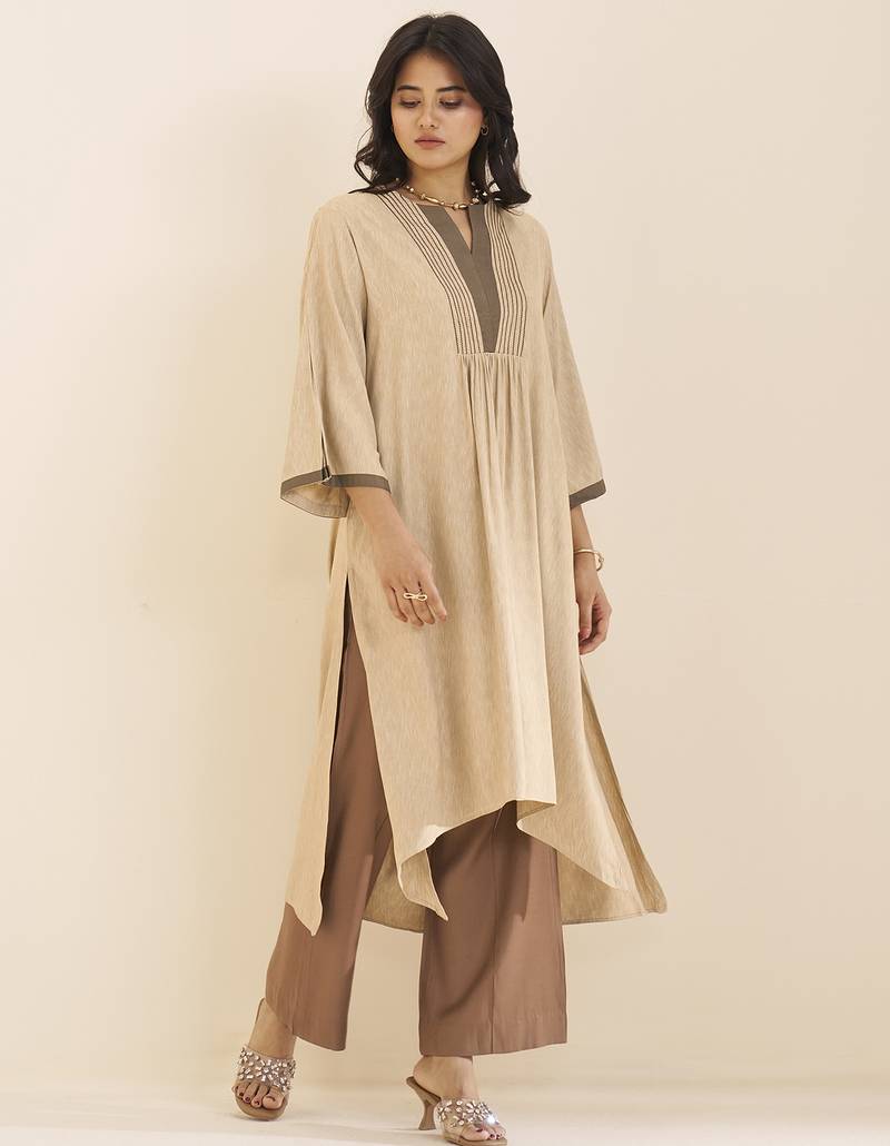 Women’s beige viscose blend v neck kurta with front pleat design