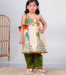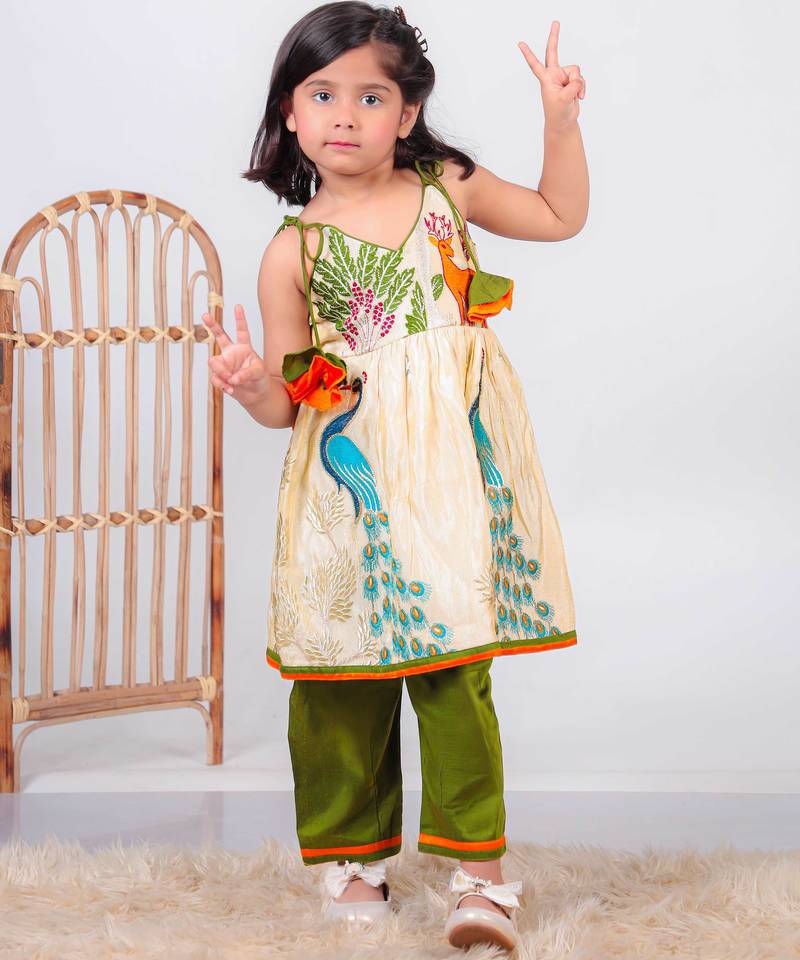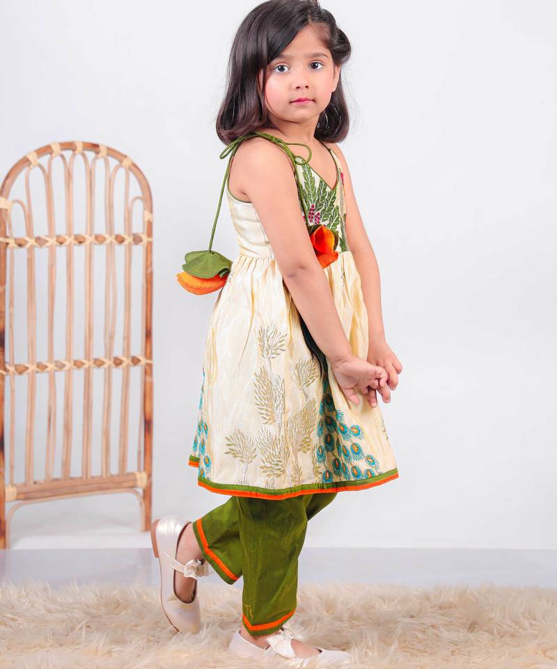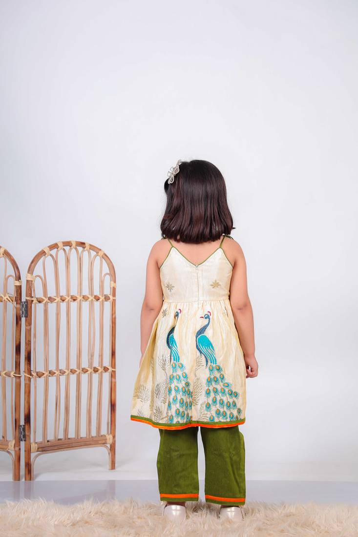 | Product Description | Add A Playful And Traditional Touch To Your Little One’s Wardrobe With This Beige Kurti And Green Pant Set, Designed With Colorful Motifs And Crafted For Comfort. A Perfect Choice For Festive Wear And Family Occasions. Crafted From Pure Paithani Silk, The Kurti Offers A Soft Feel With A Slight Sheen That Enhances Its Overall Look. The Design Features Vibrant Embroidery And Printed Motifs Inspired By Nature, Including Peacock And Floral Elements That Bring A Lively And Cheerful Appeal. The Sleeveless Style With Tie Up Straps Adds A Cute And Comfortable Fit. The Set Is Paired With Green Pants Made From Cotton Silk Fabric, Offering A Smooth And Breathable Feel For All Day Comfort. The Contrast Between The Beige Kurti And Green Bottom Creates A Balanced And Eye Catching Look. Suitable For Festive Occasions, Celebrations, And Traditional Gatherings, This Outfit Pairs Well With Simple Accessories And Comfortable Footwear For A Neat And Adorable Appearance. |