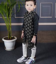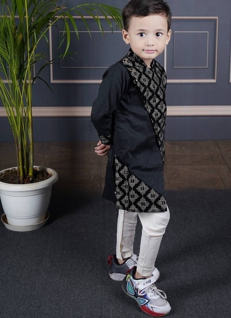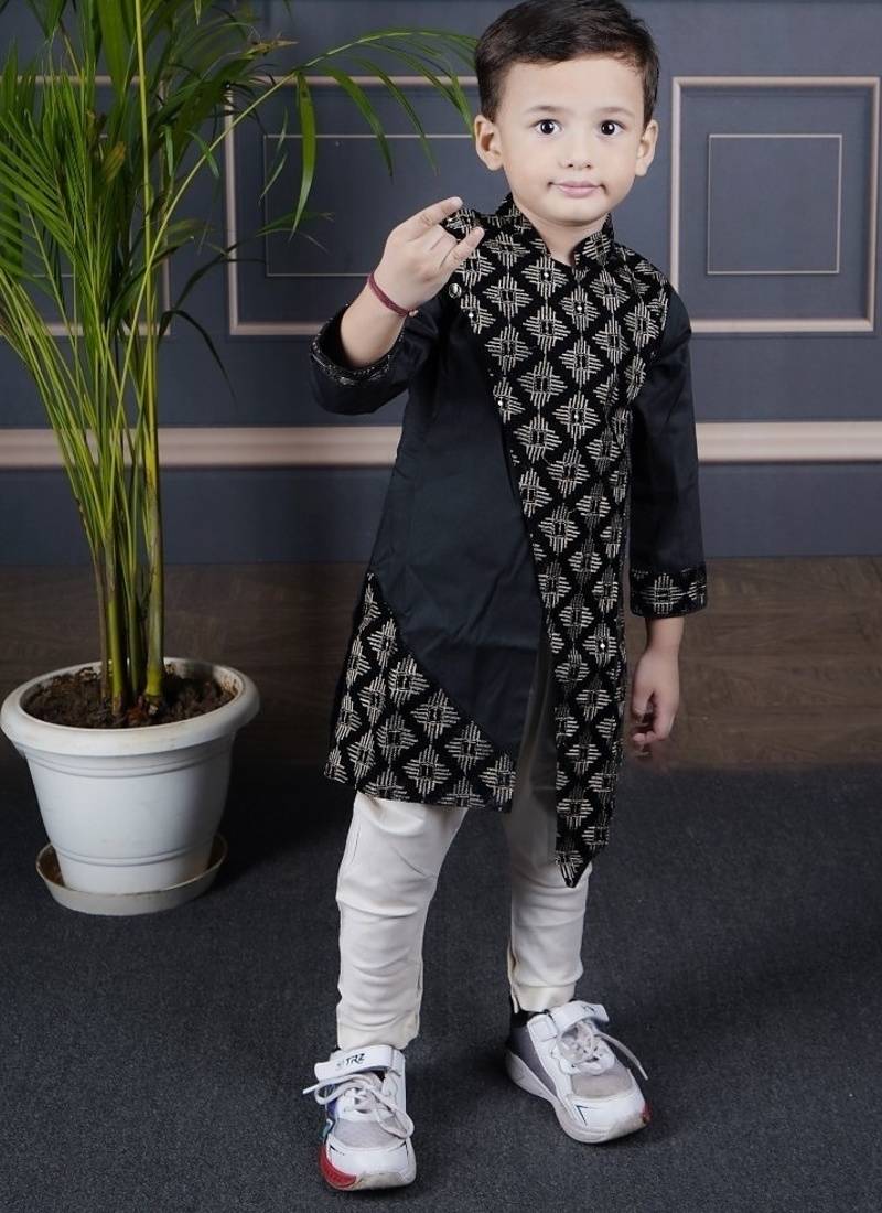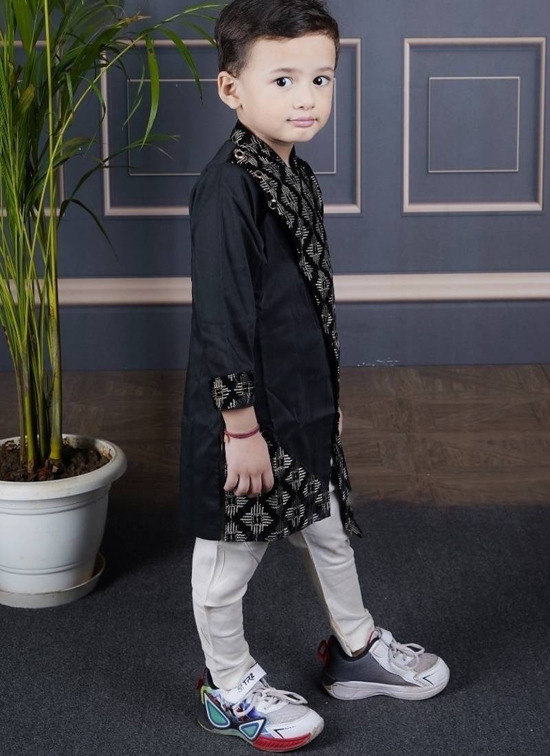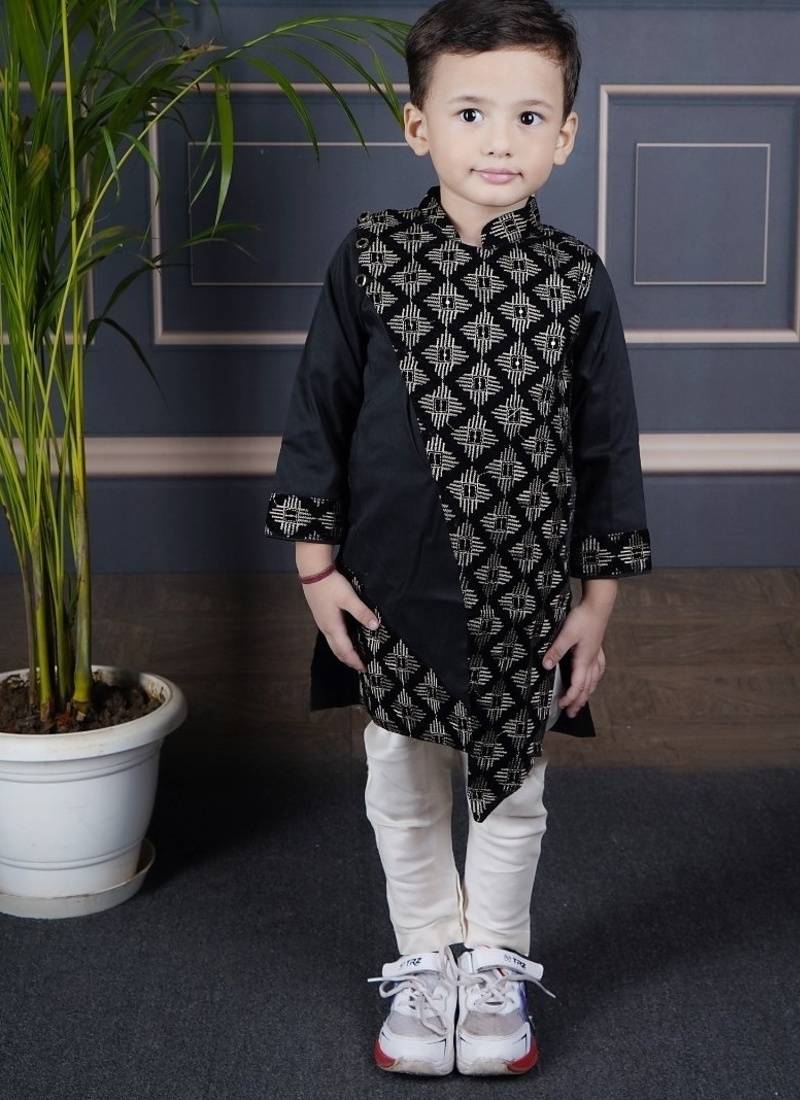 The Rich Black Kurta Features Detailed Patterns That Add A Festive Appeal, While The Crisp White Pants Balance The Look With A Clean And Stylish Finish. Crafted For Comfort And Ease Of Movement, It’s Ideal For Active Kids During Long Celebrations.