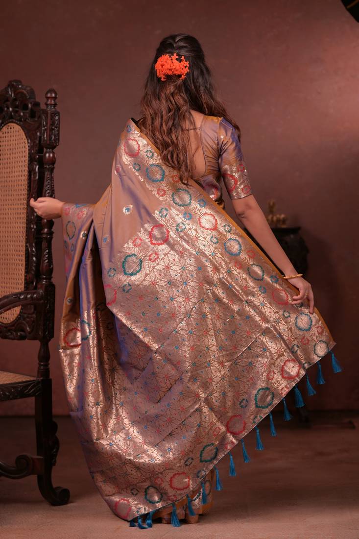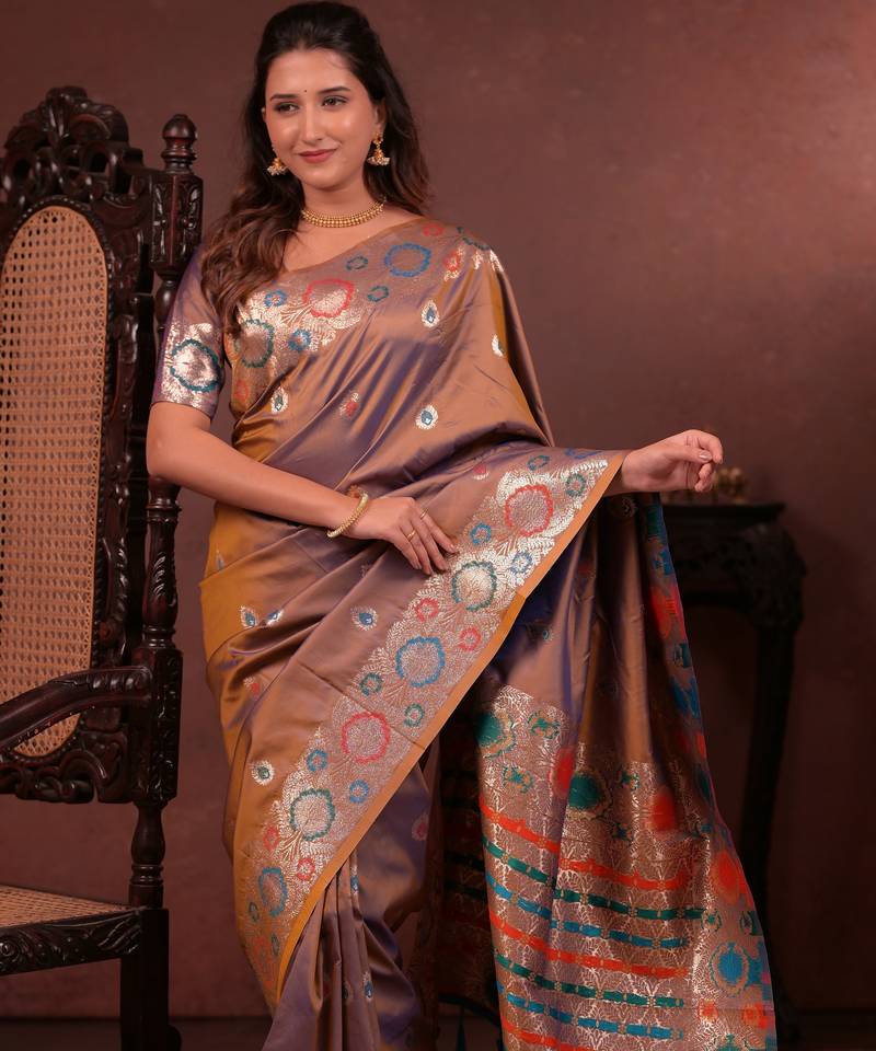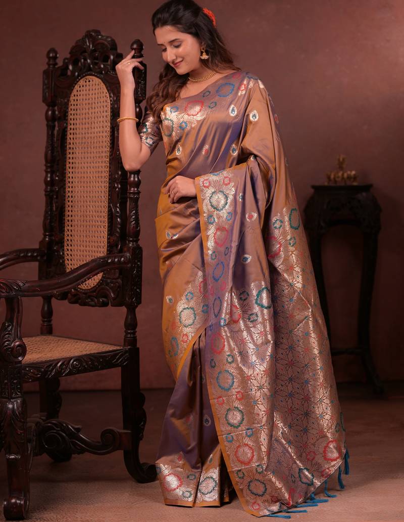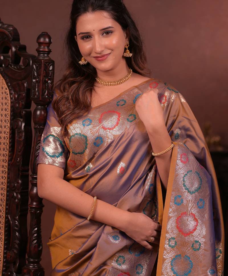 Brown floral, zari woven faux kanjivaram saree with blouse