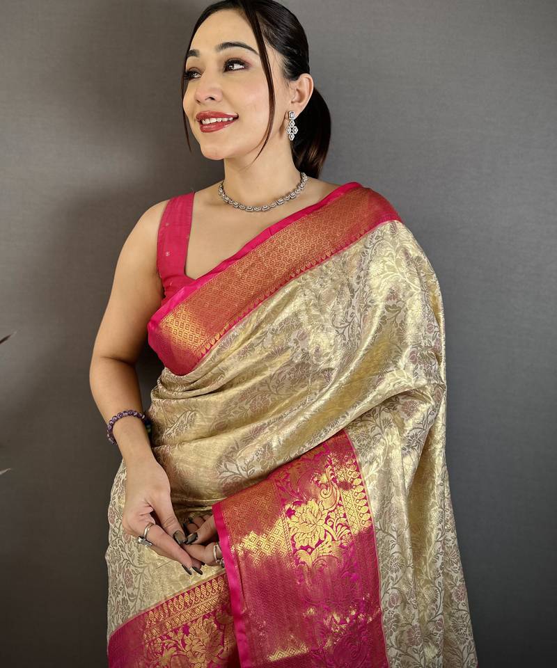 Dark pink floral, zari woven kanchipuram silk saree with blouse