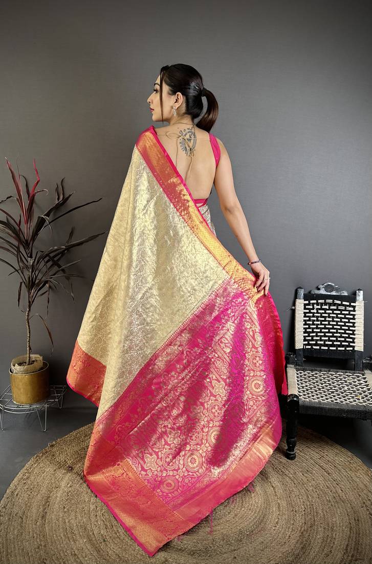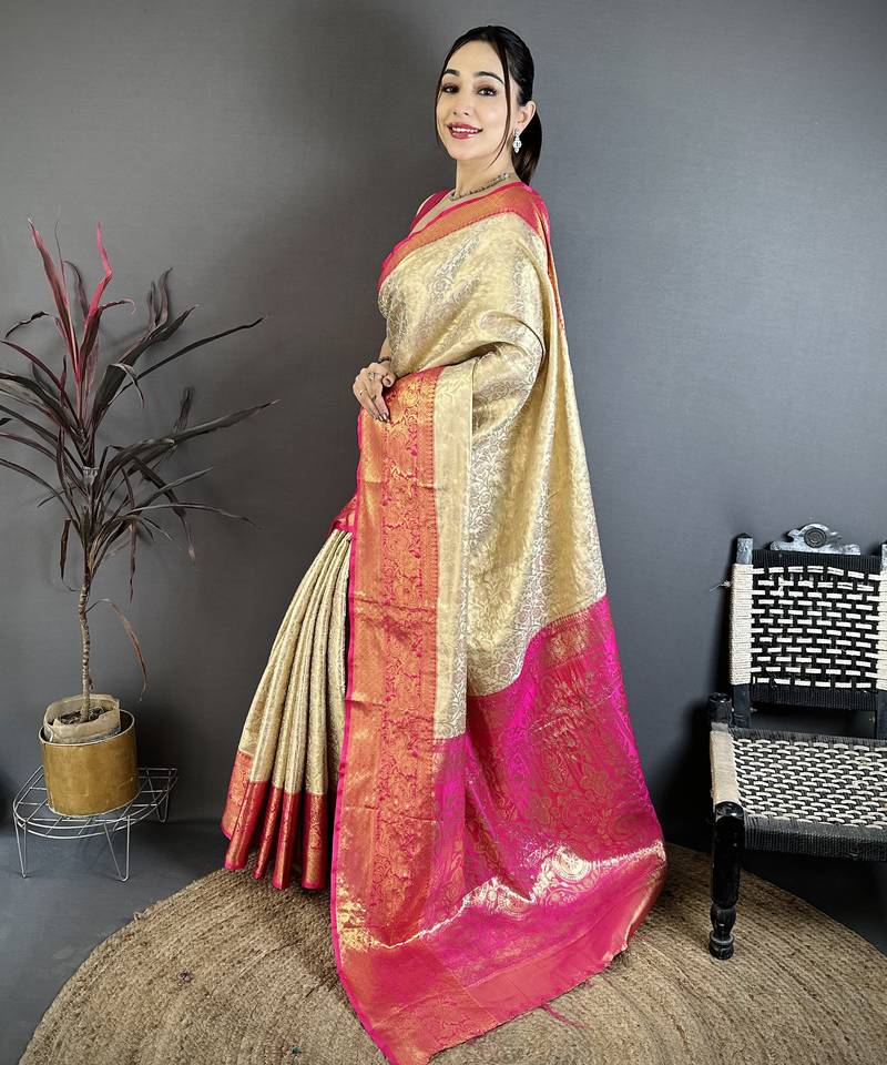 | Product Description | Elevate Your Ethnic Wardrobe With This Exquisite Golden Silk Saree, Beautifully Adorned With Rich Accents. Crafted With Intricate Zari Weaving, The Saree Features Elegant Traditional Motifs And A Luxurious Sheen That Adds A Regal Touch To Your Look. The Finely Detailed Border And Pallu Showcase Timeless Artistry, Making It Perfect For Weddings, Festive Occasions, And Special Celebrations. Paired With A Complementing Blouse, This Saree Effortlessly Blends Classic Charm With Contemporary Elegance. Its Soft, Graceful Drape Ensures Both Comfort And Sophistication, Allowing You To Make A Lasting Impression Wherever You Go. |