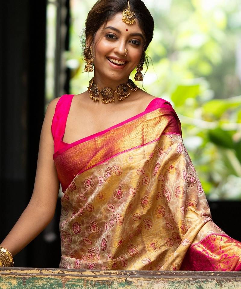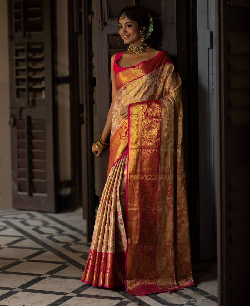 Gold floral, zari work faux kanjivaram semi silk saree with blouse
