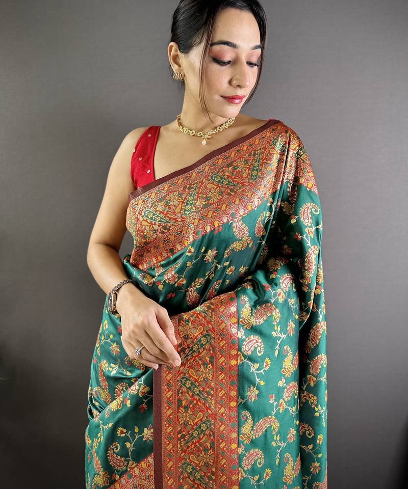Green floral, paisely, zari woven banarasi silk saree with blouse