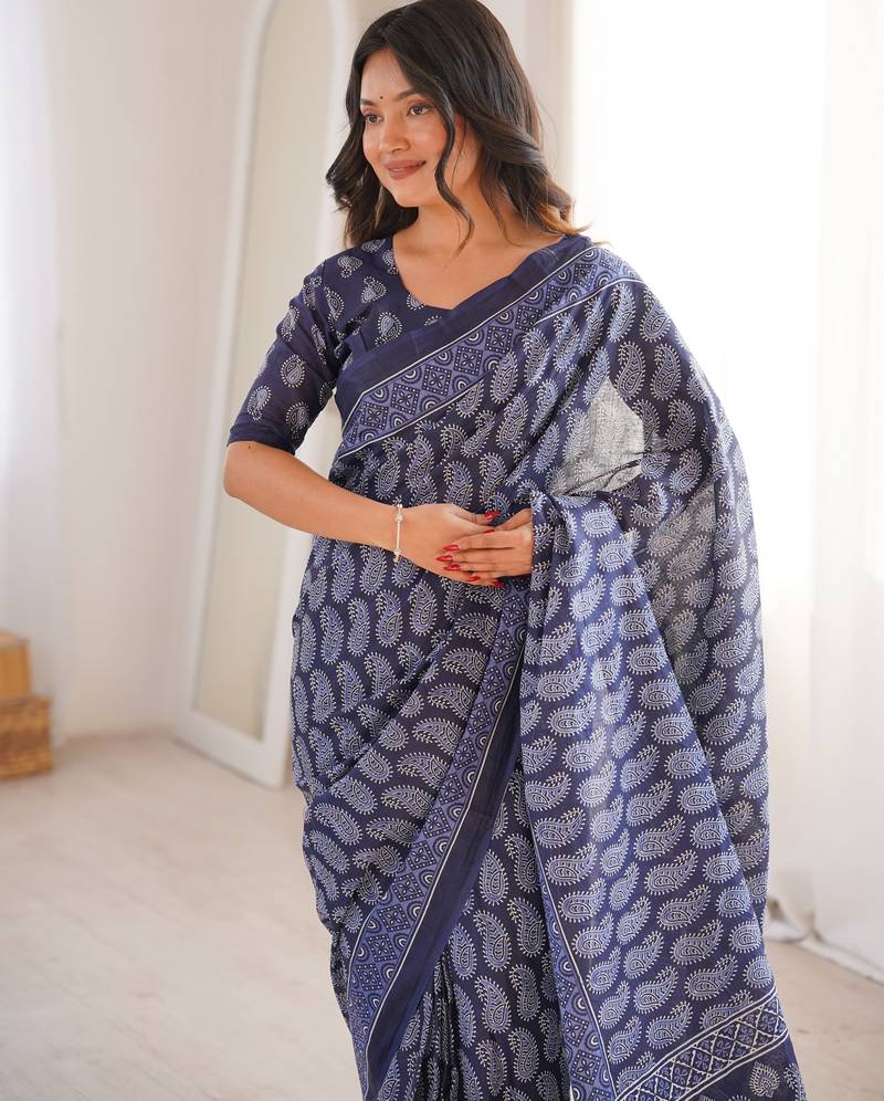Navy blue blocked printed, paisley soft pure cotton saree with blouse.