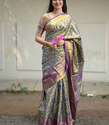 Olive green floral, zari woven faux kanjivaram semi silk saree with blouse