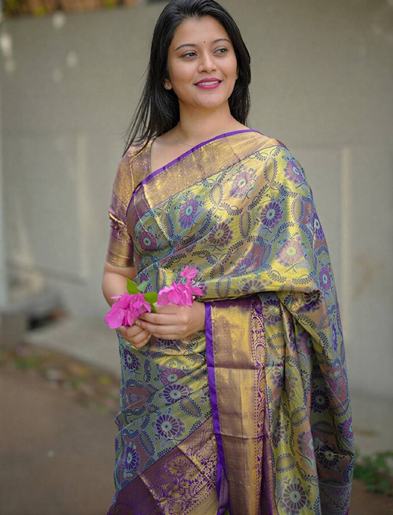 olive green floral, zari woven faux kanjivaram  semi silk saree with blouse