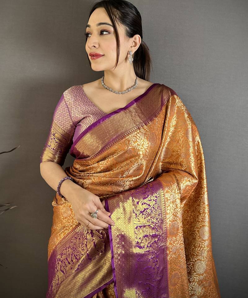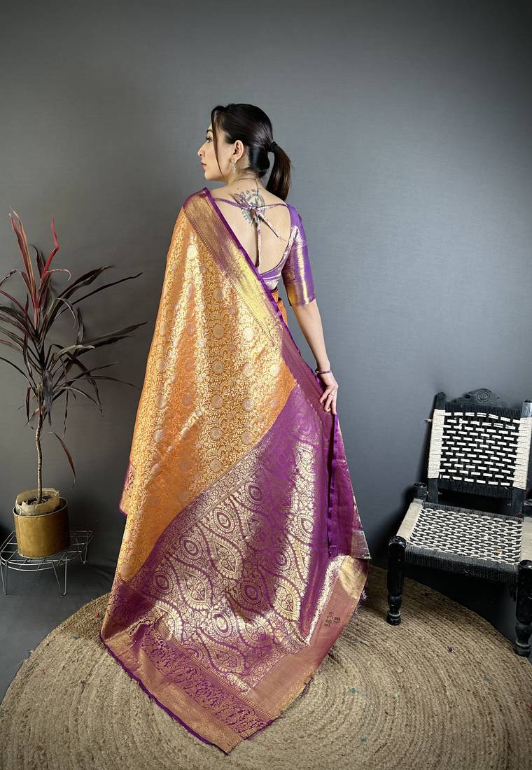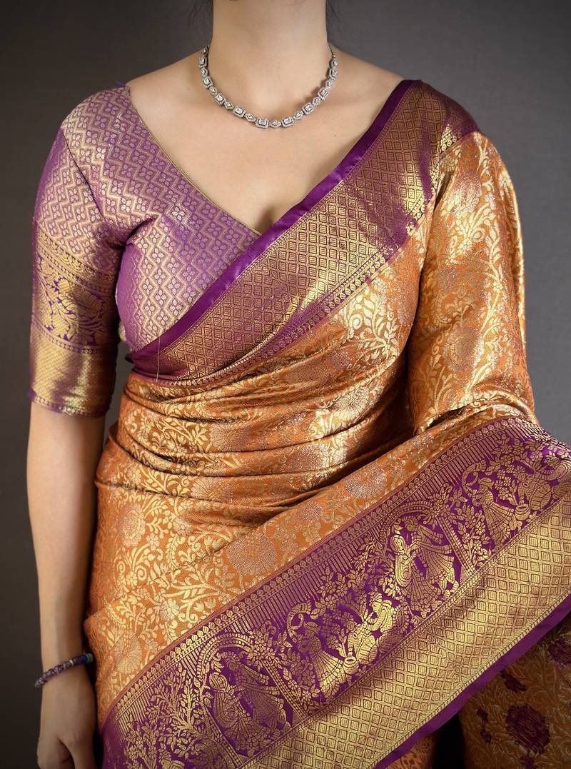 Orange floral, kanjivaram, zari woven kanchipuram silk saree with blouse