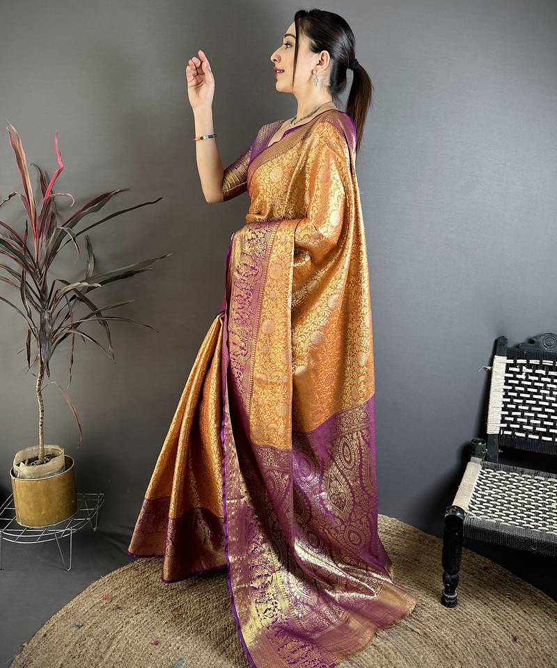 | Product Description | Elevate Your Ethnic Wardrobe With This Exquisite Golden Silk Saree, Beautifully Adorned With Rich Accents. Crafted With Intricate Zari Weaving, The Saree Features Elegant Traditional Motifs And A Luxurious Sheen That Adds A Regal Touch To Your Look. The Finely Detailed Border And Pallu Showcase Timeless Artistry, Making It Perfect For Weddings, Festive Occasions, And Special Celebrations. Paired With A Complementing Blouse, This Saree Effortlessly Blends Classic Charm With Contemporary Elegance. Its Soft, Graceful Drape Ensures Both Comfort And Sophistication, Allowing You To Make A Lasting Impression Wherever You Go. |