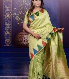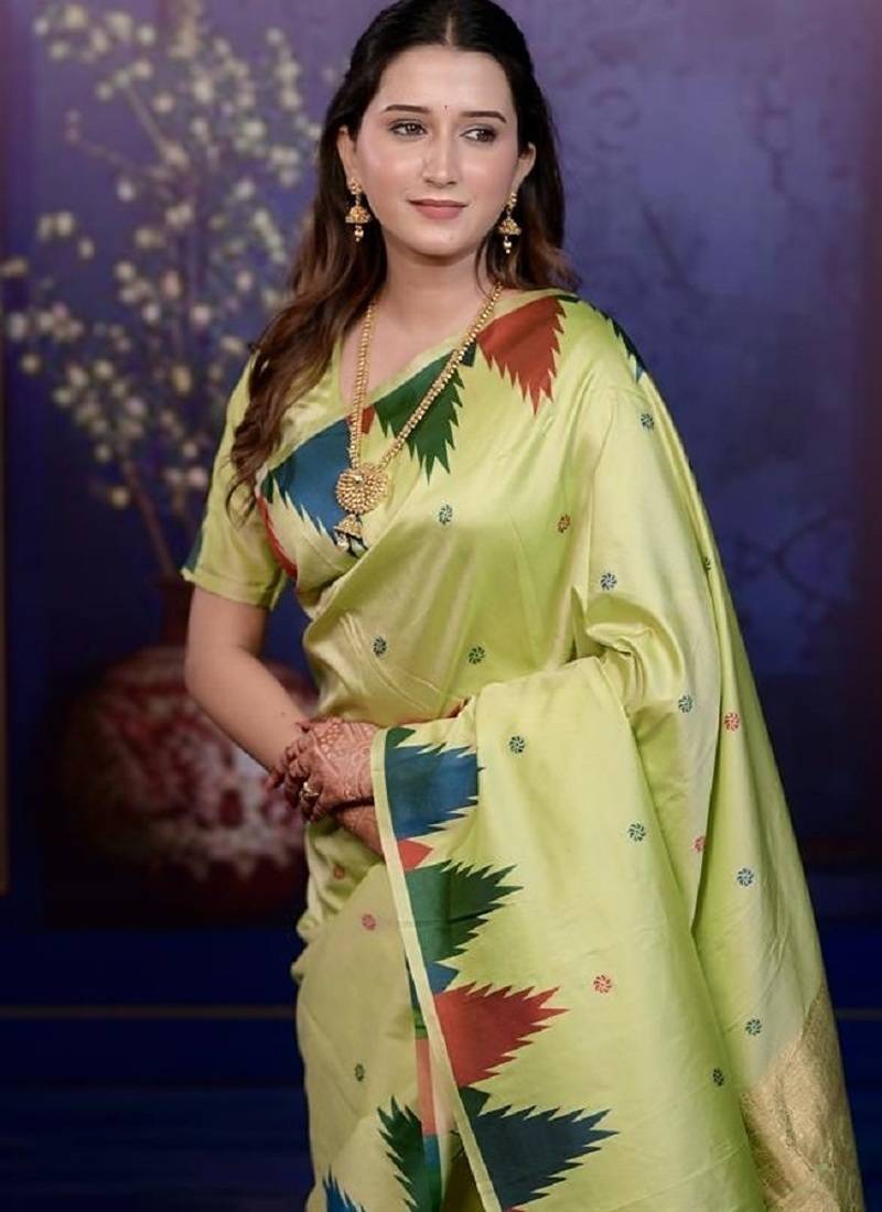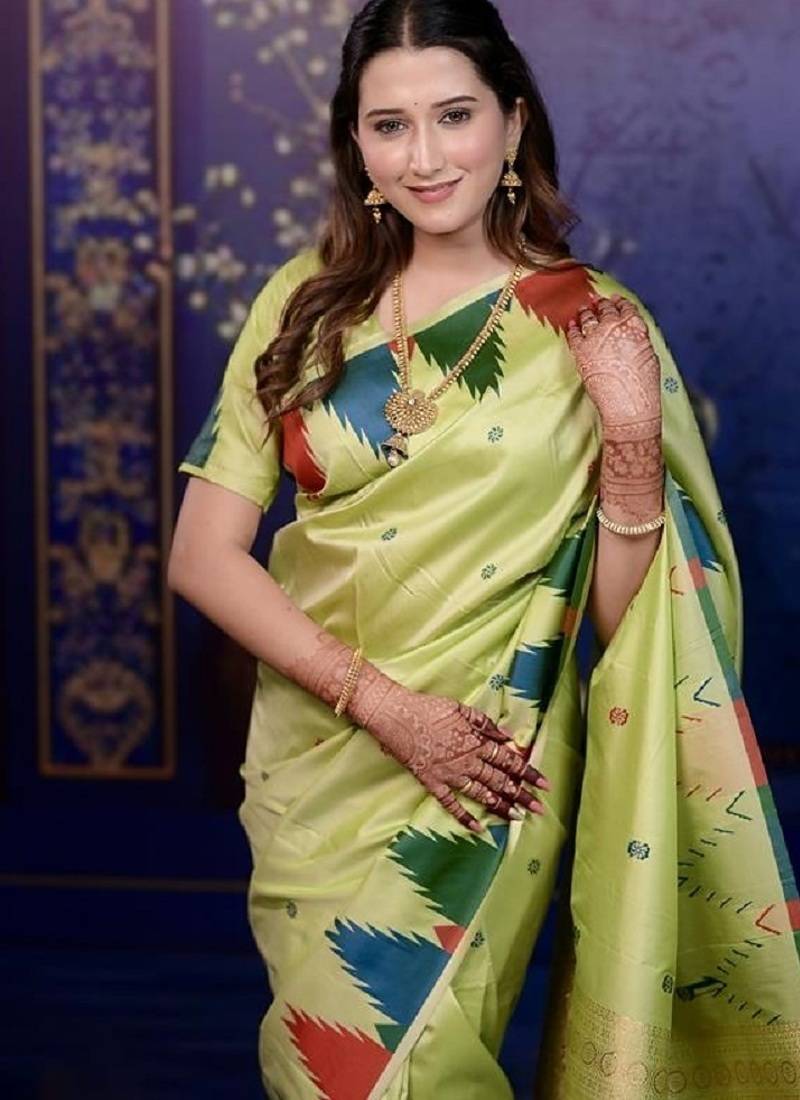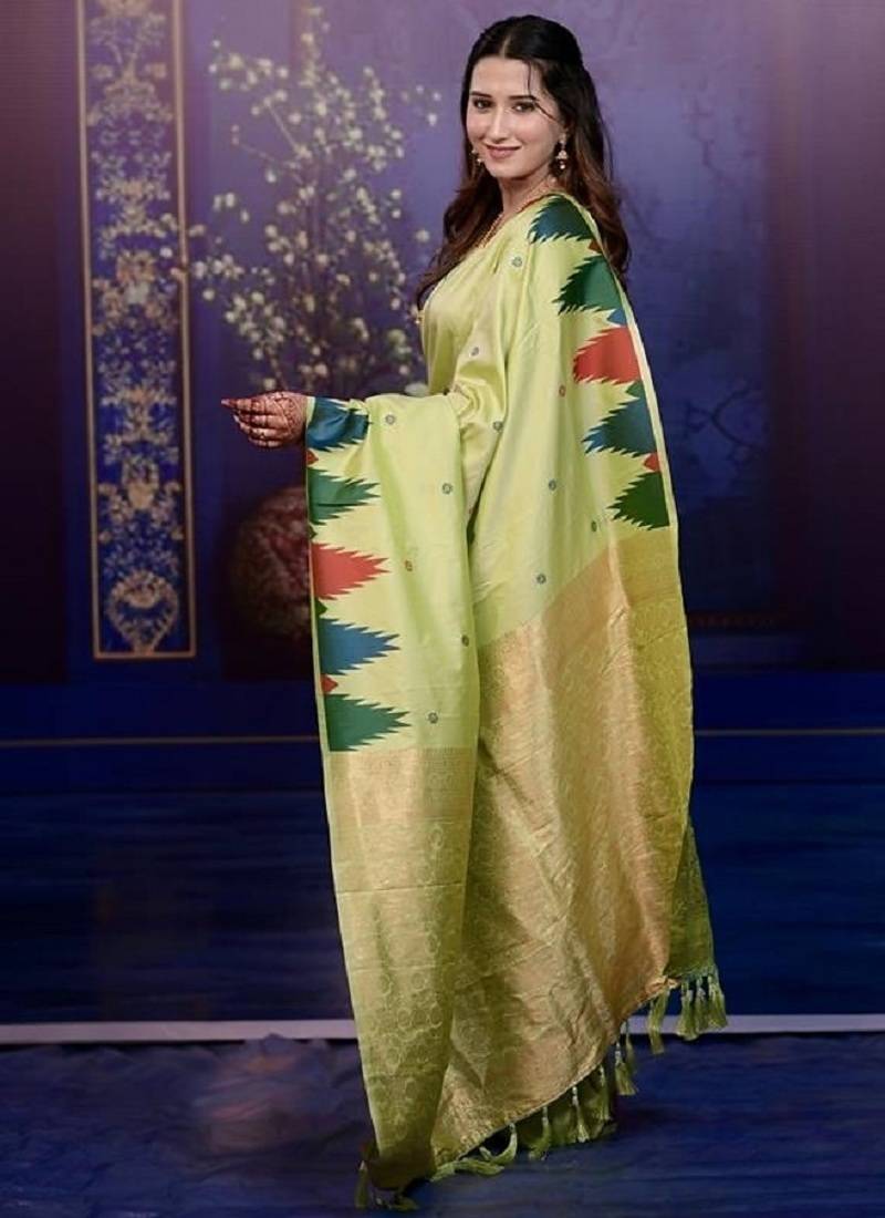 | Product Name | Parrot Green Temple Border, Zari Work Soft Silk Saree With Blouse | |