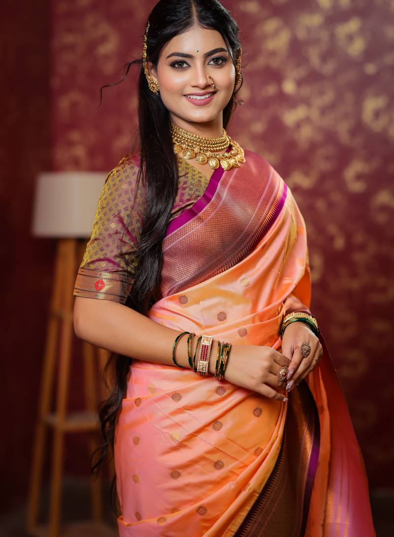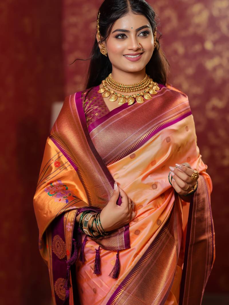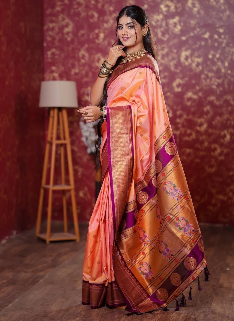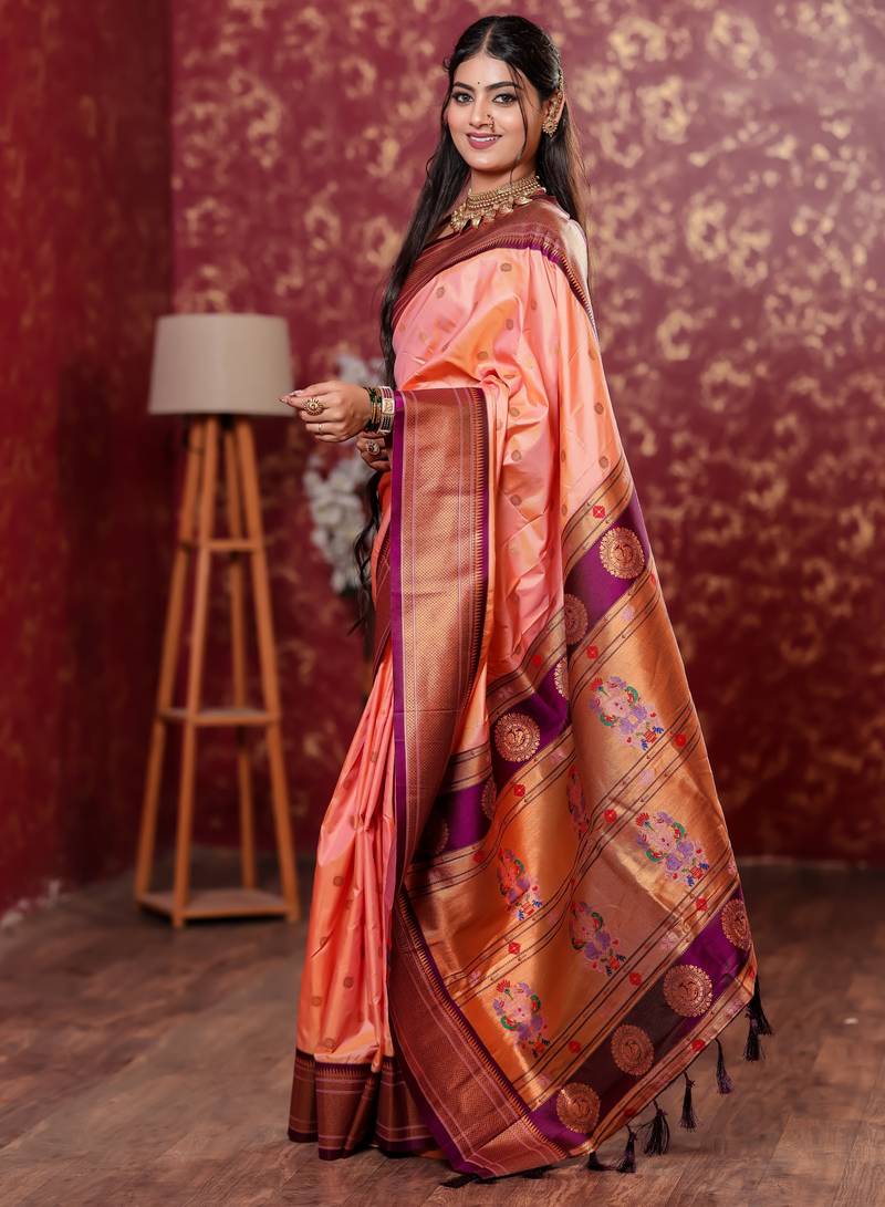 | • | Saree | : | Color- Peach / Fabric- Pure Silk |