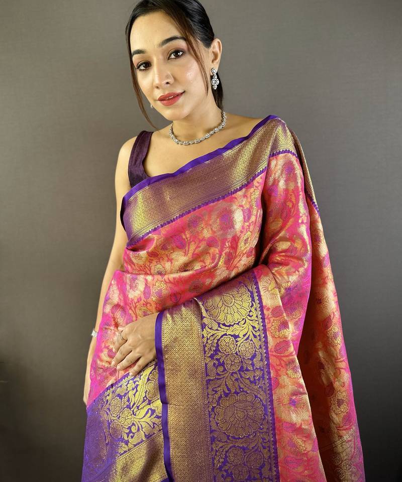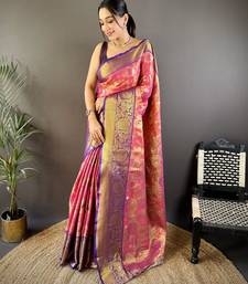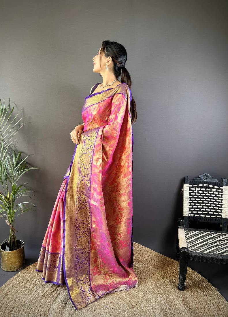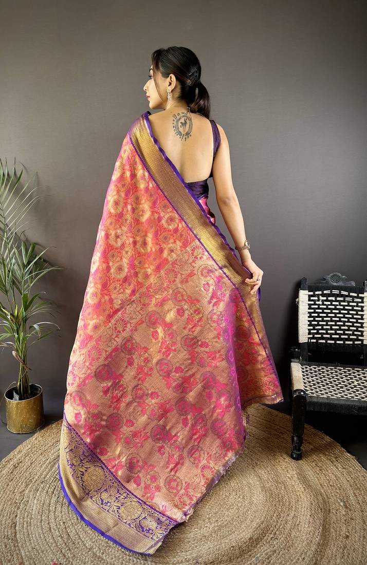Pink floral, zari woven kanjivaram tissue silk saree with blouse