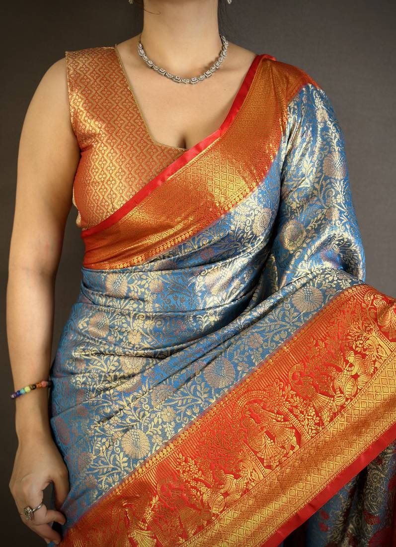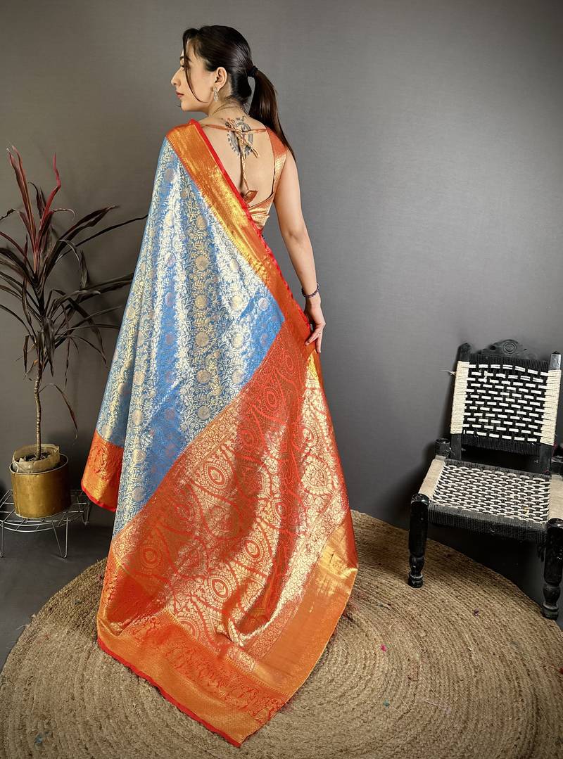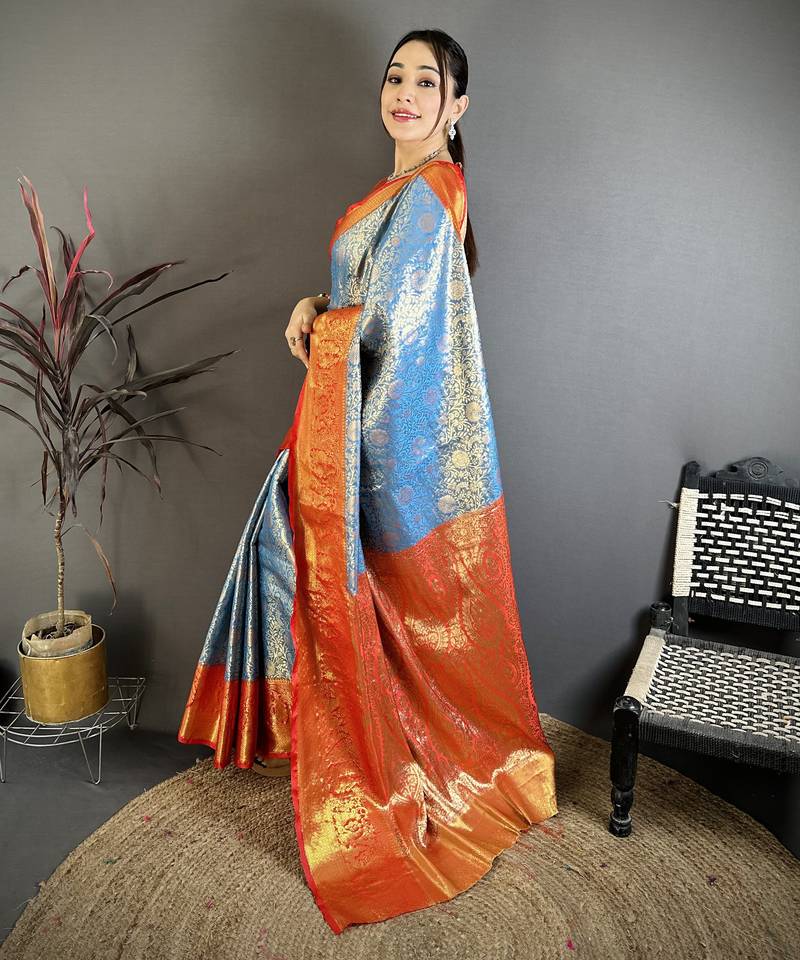 Sky blue floral, kanjivaram, zari woven kanchipuram silk saree with blouse