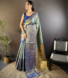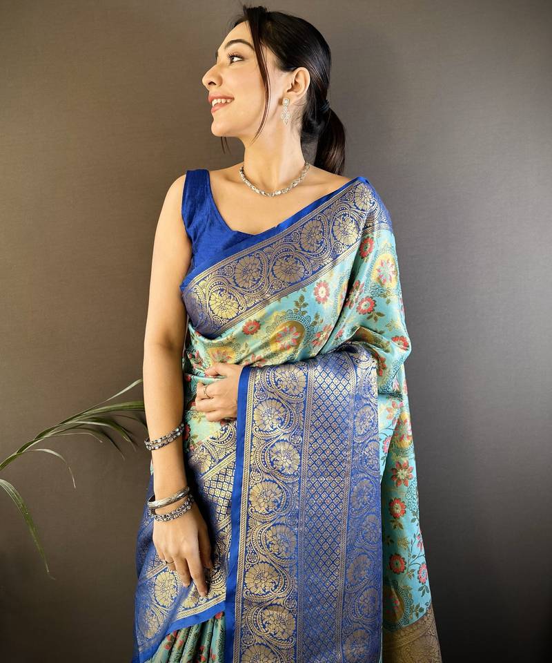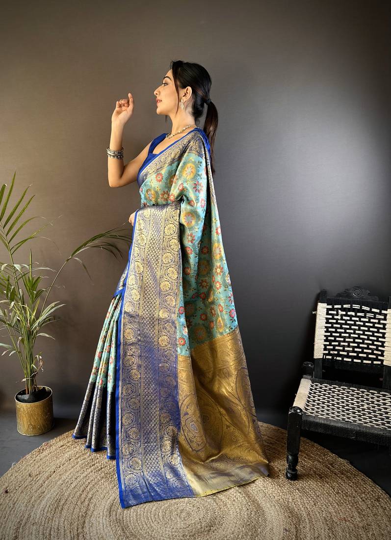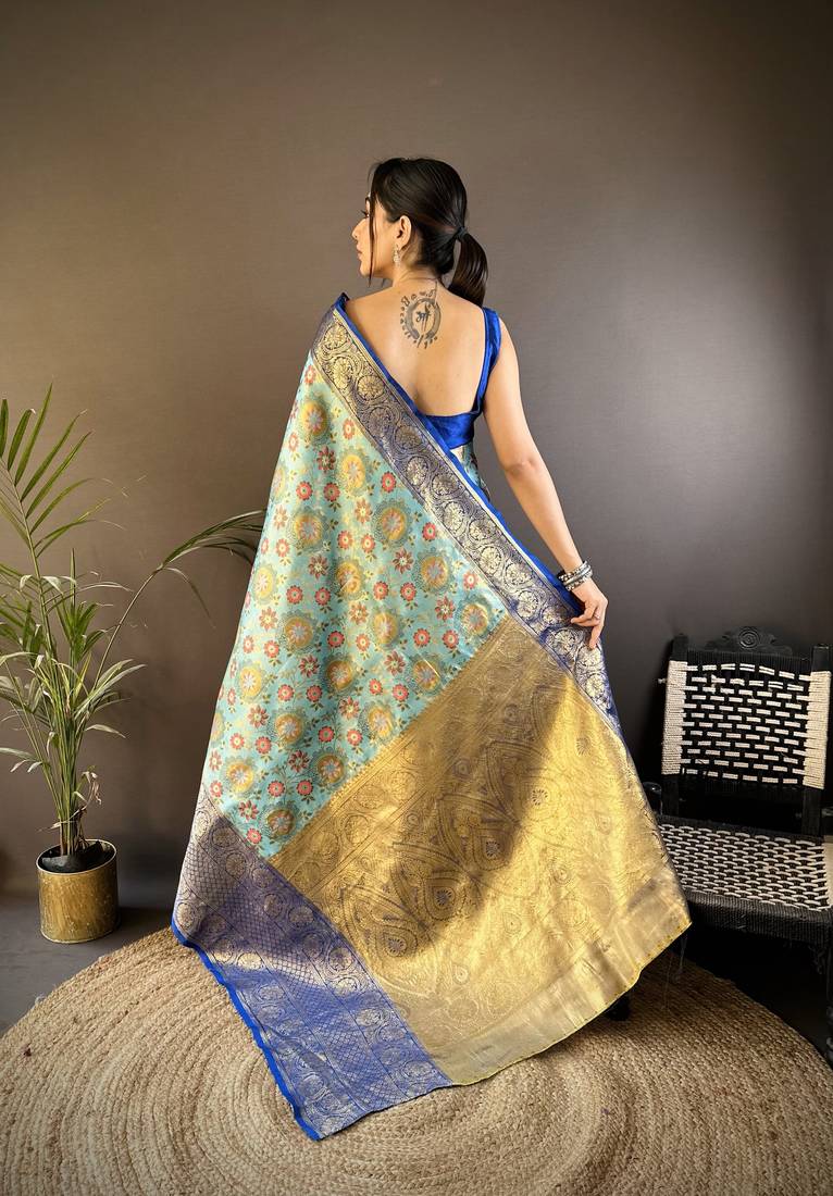 Sky blue floral, zari woven kanjivaram tissue silk saree with blouse