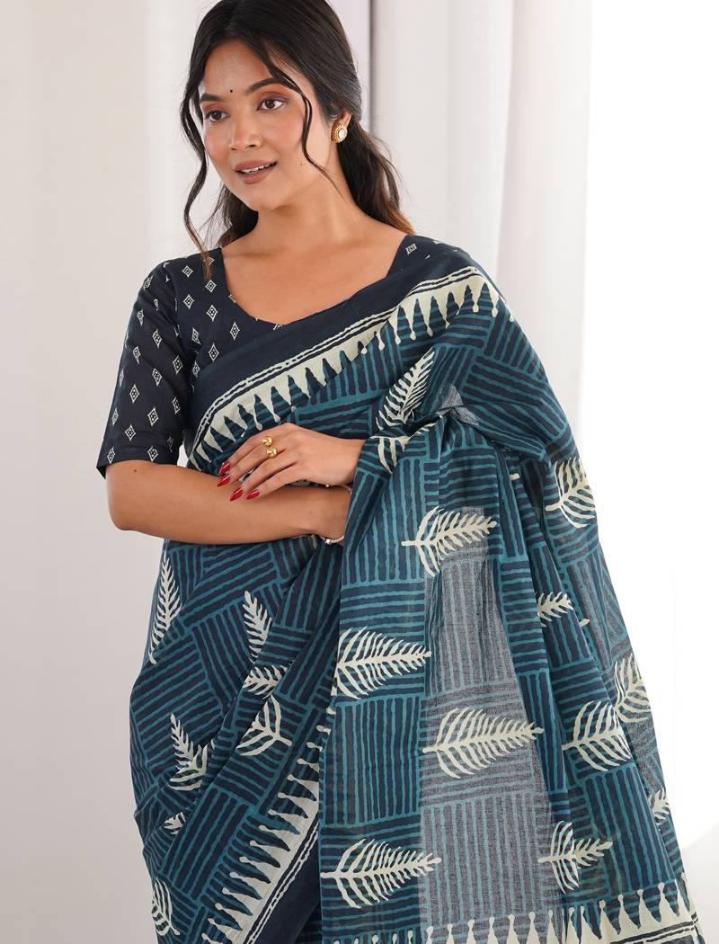 Teal blue blocked printed, floral print, geometric print soft pure cotton saree with blouse.