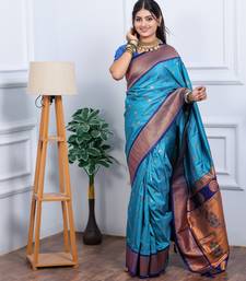 teal blue floral, temple border, zari woven silk blend saree with blouse