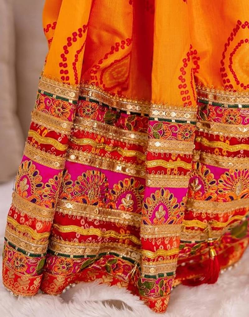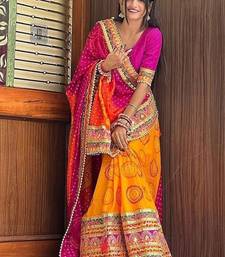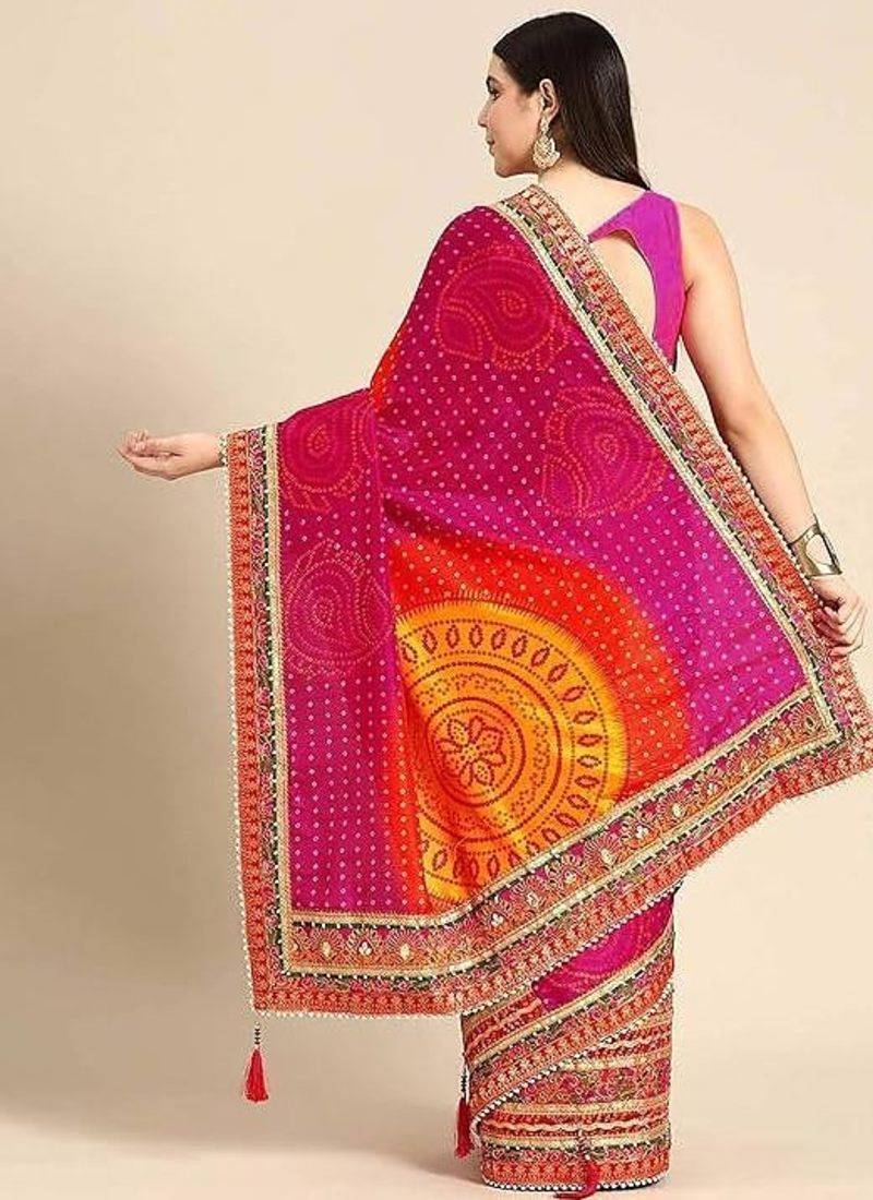 | Product Name | Pink & Yellow Bandhani Silk Saree With Embroidered Border | |