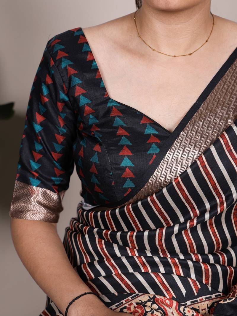| Product Name | Black Elegant Tussar Silk Printed With Viscose Border Saree | |