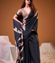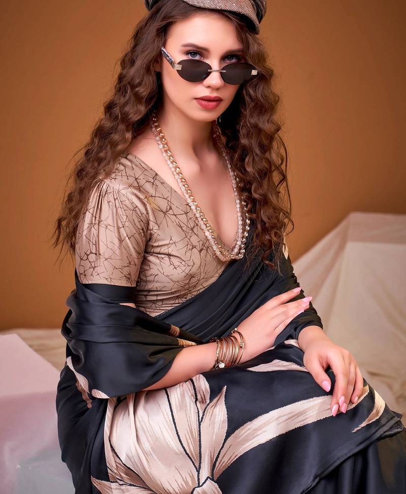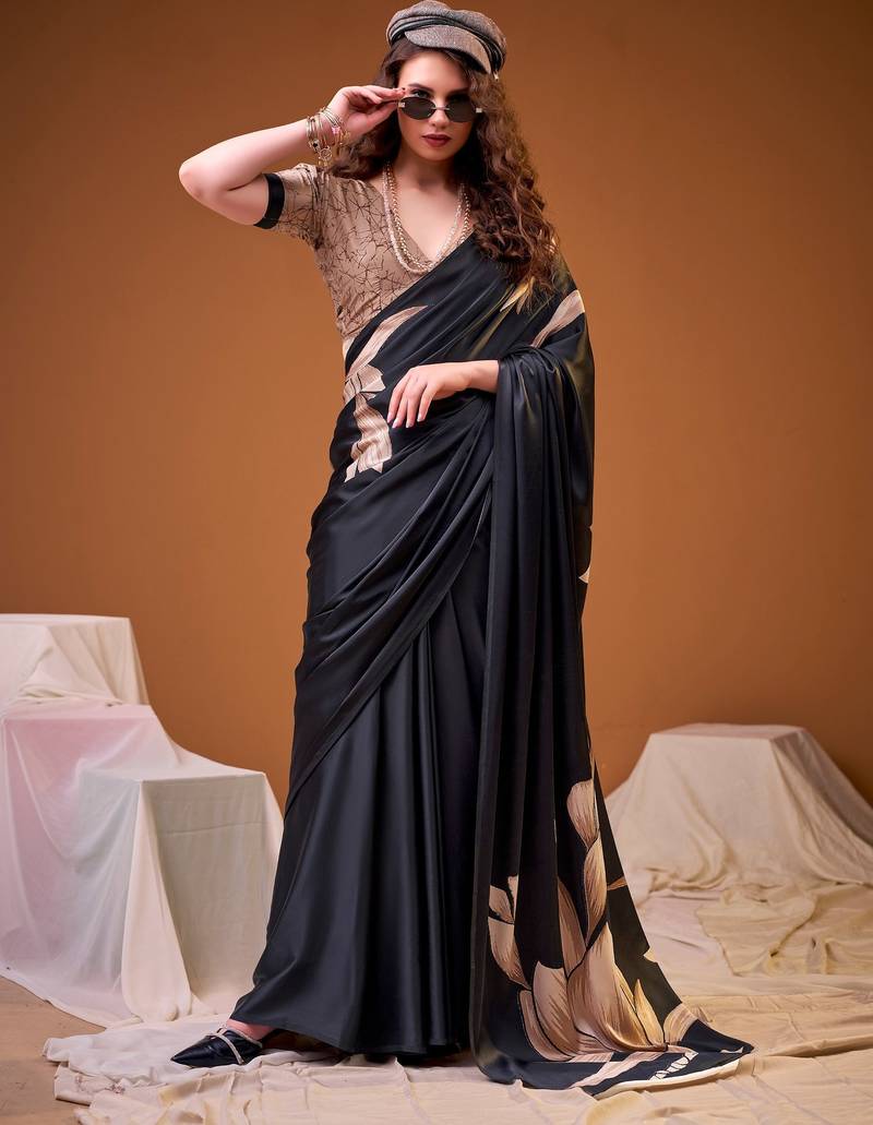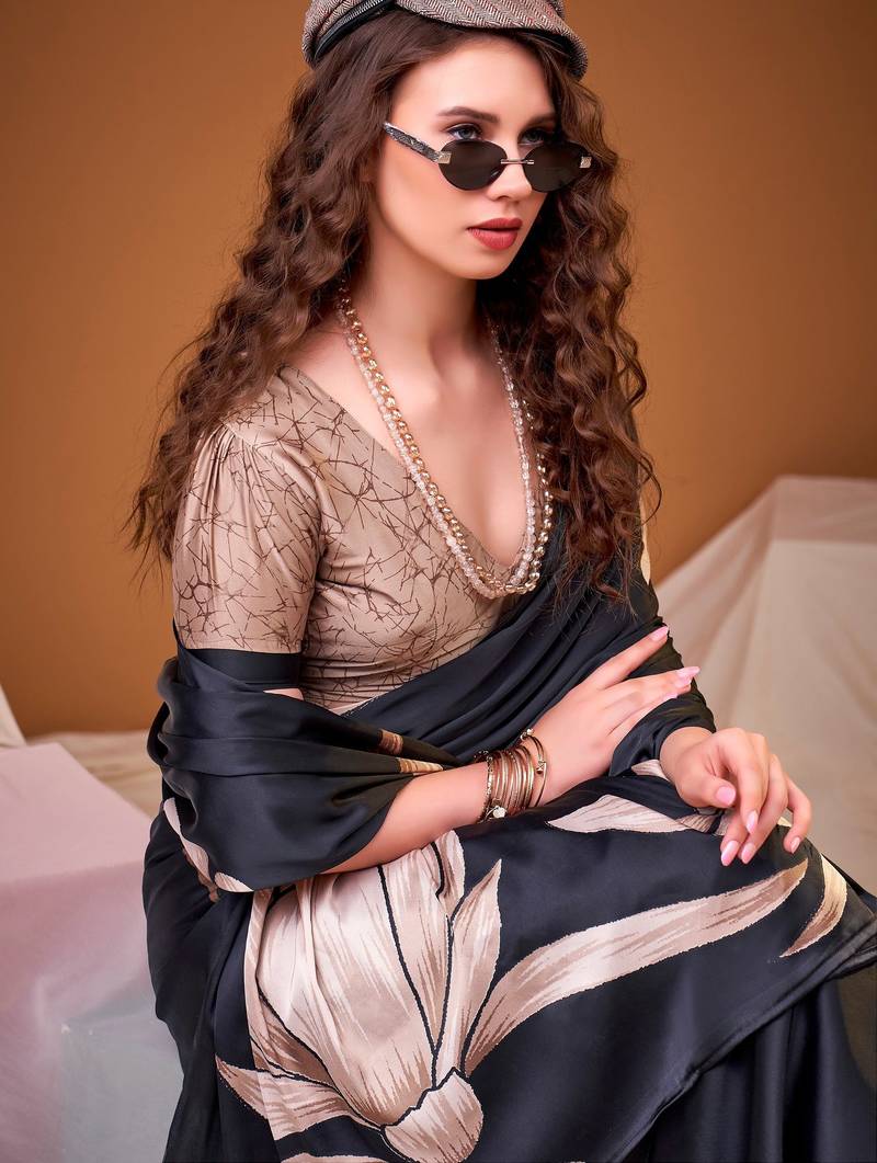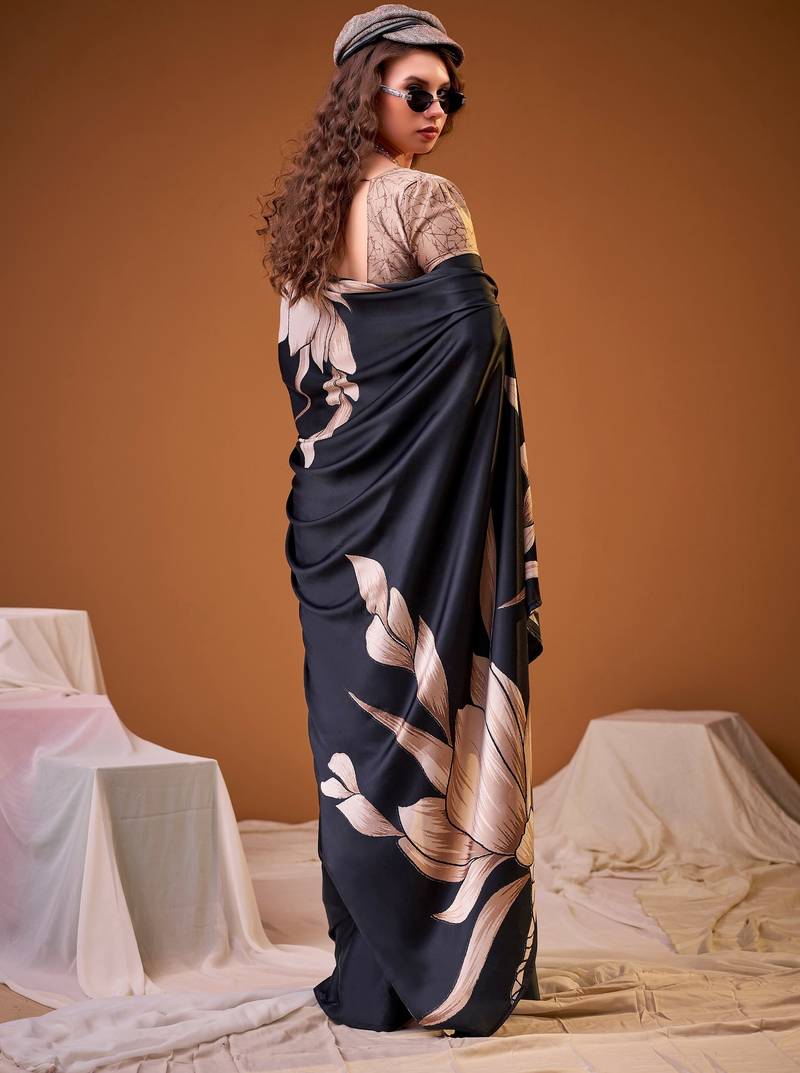Black satin silk floral printed smoothness saree