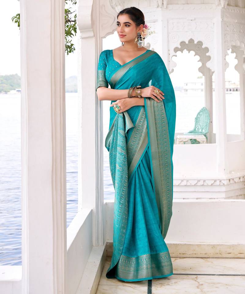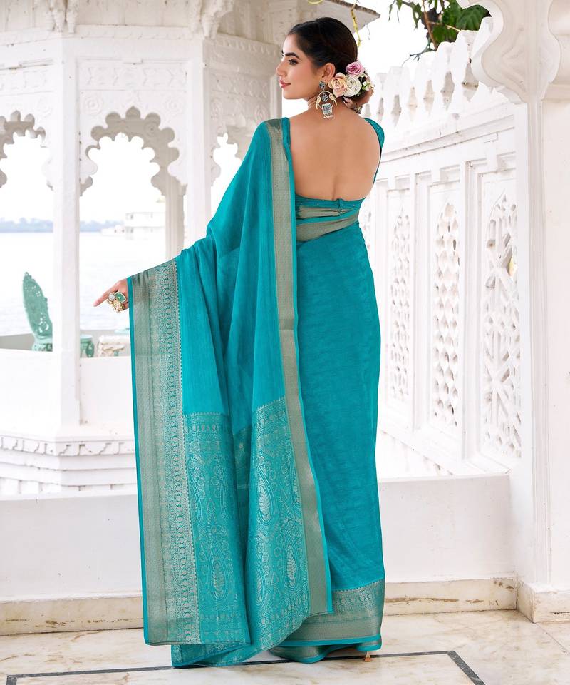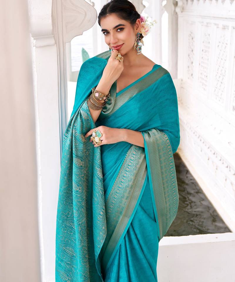 | Product Name | Firozi Self Printed Chinnon Silk Zari Weaving Work Saree | |