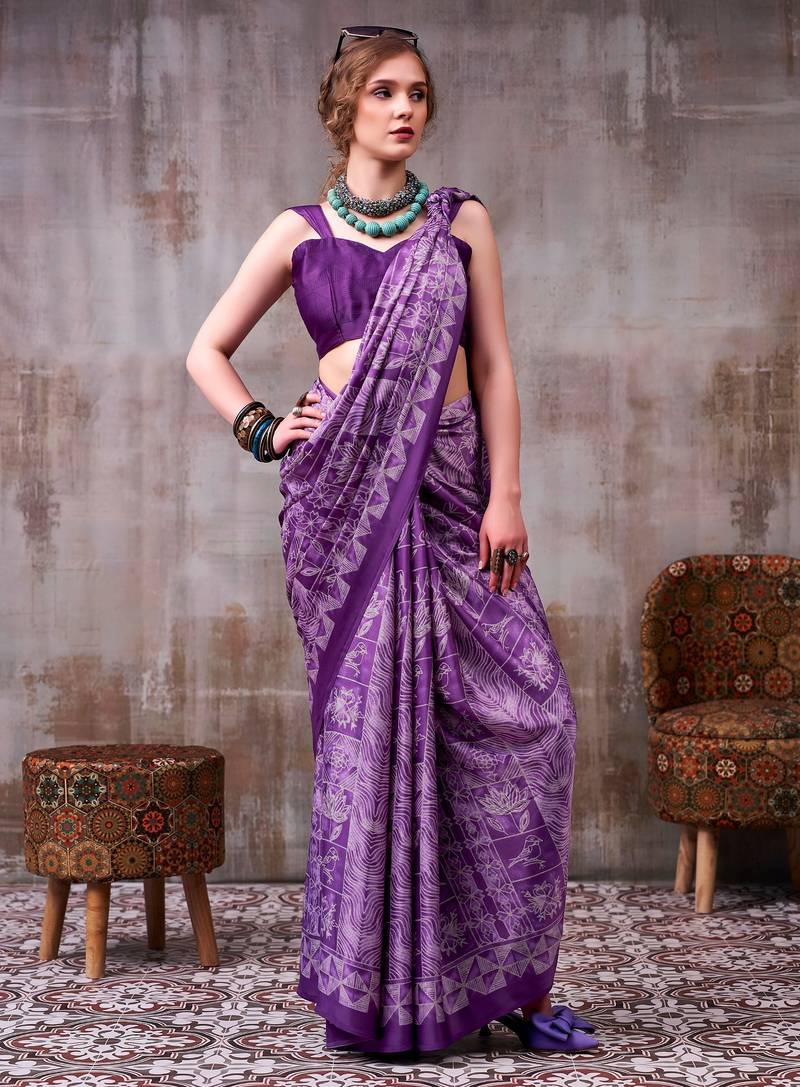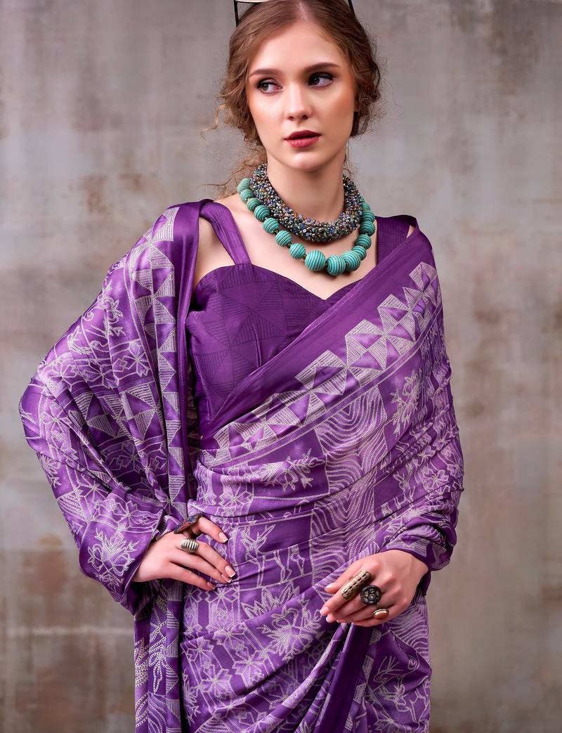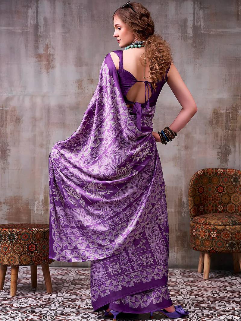 Lavender elegance satin silk floral & geometric printed saree