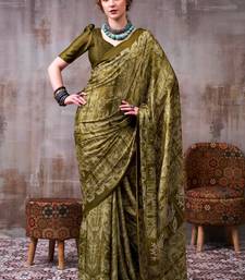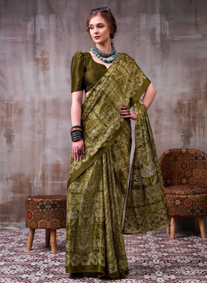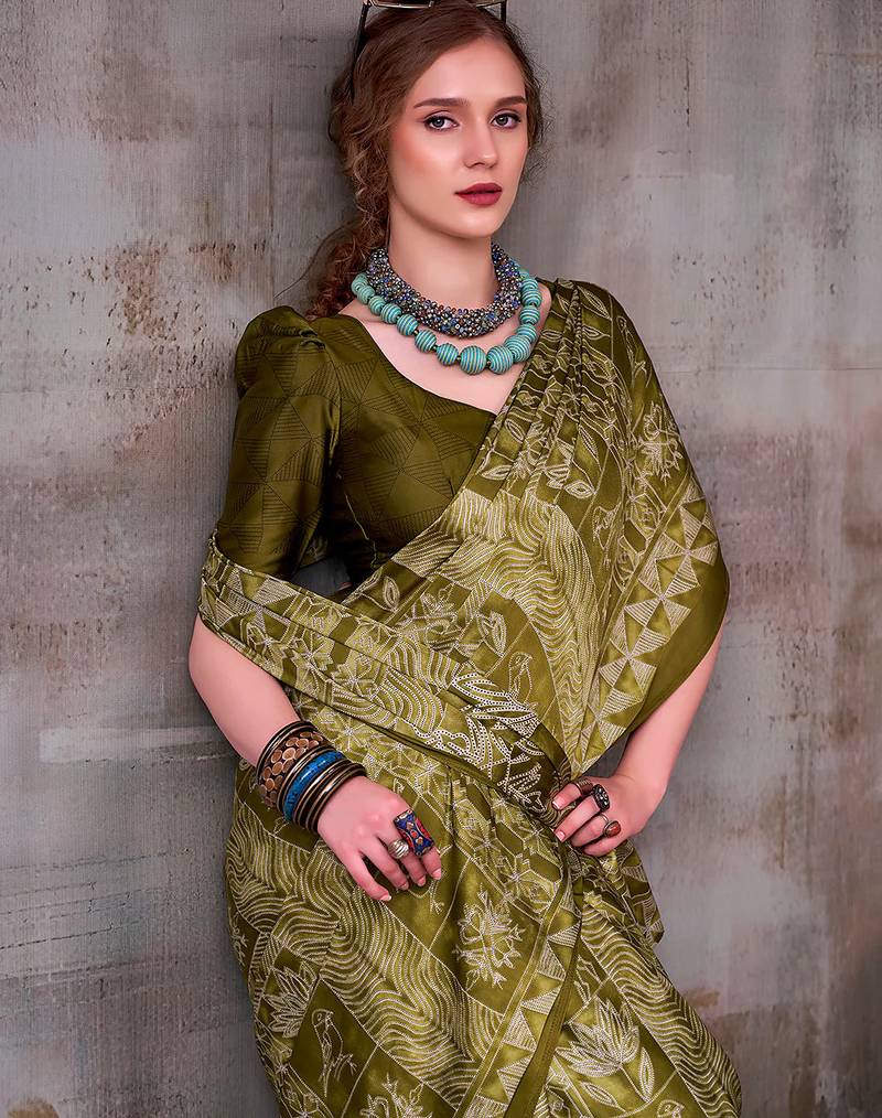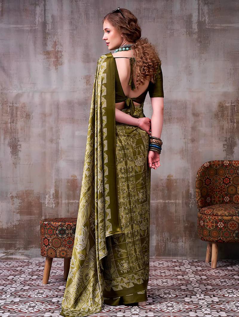Mehendi elegance satin silk floral & geometric printed saree