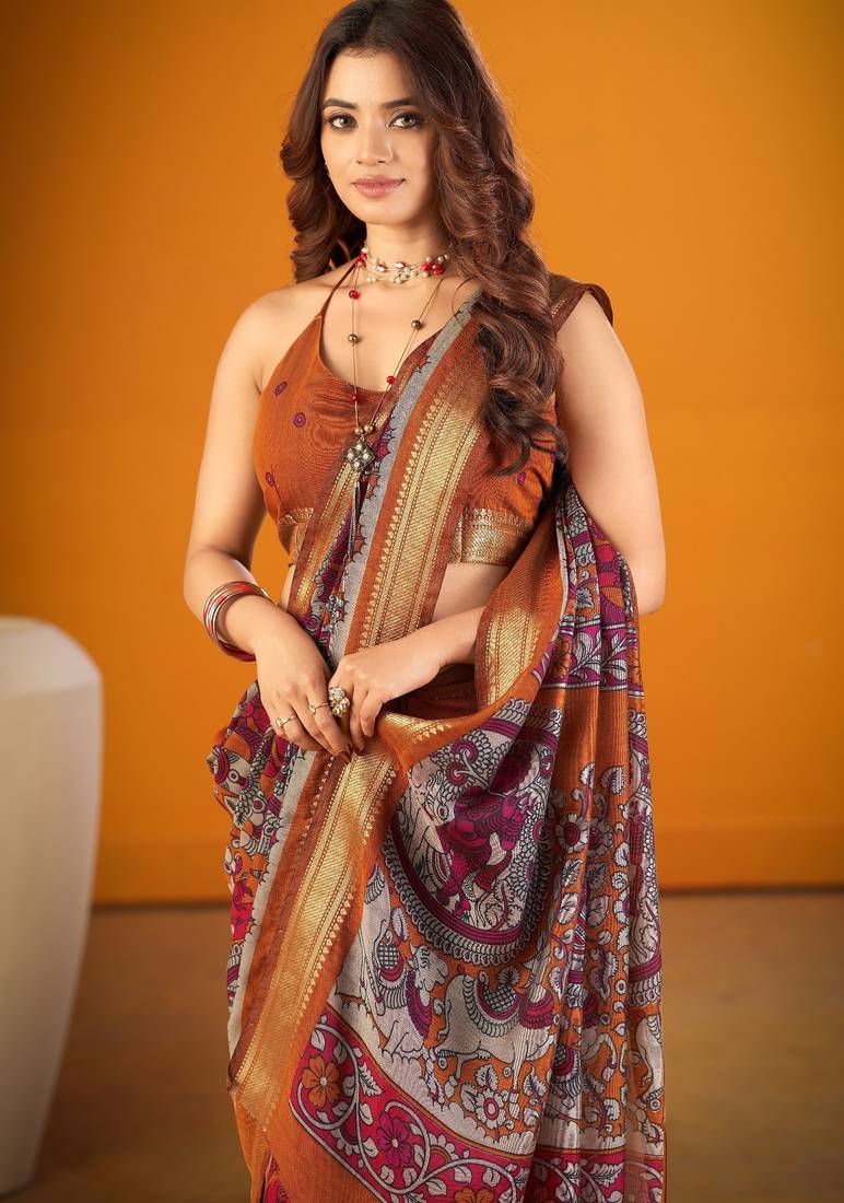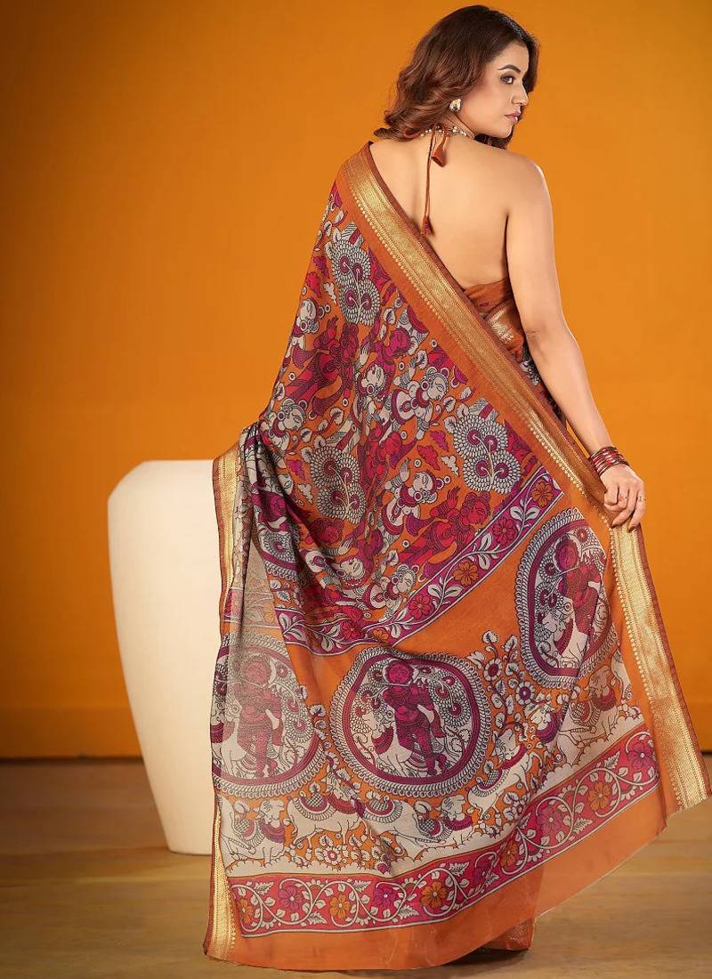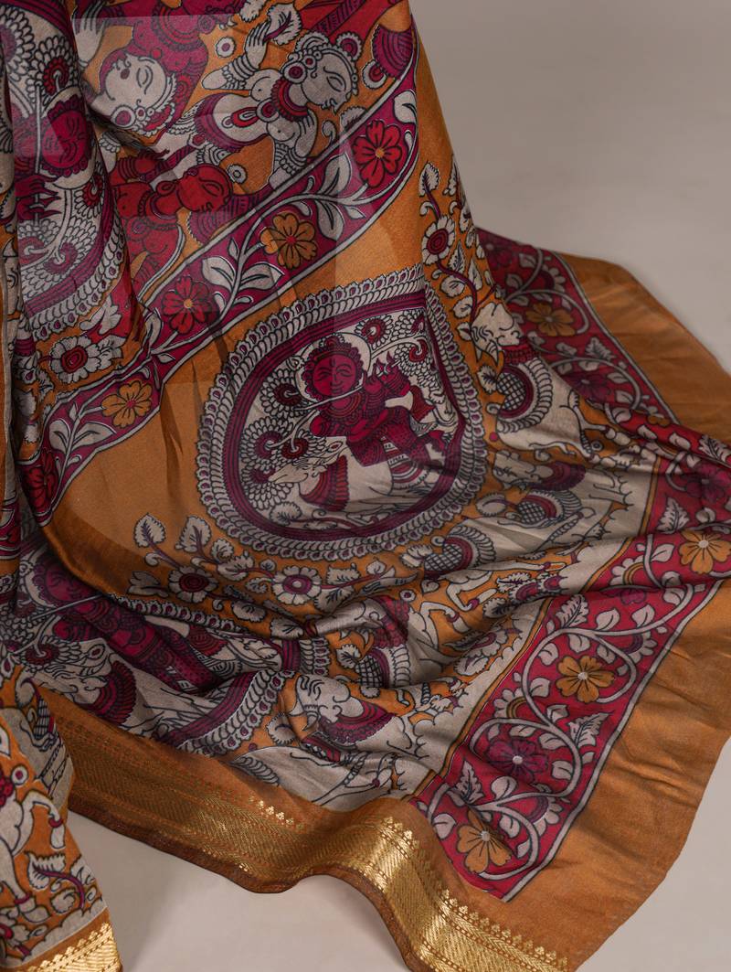 Mustard viscose chanderi kalamkari print with zari weaving work saree