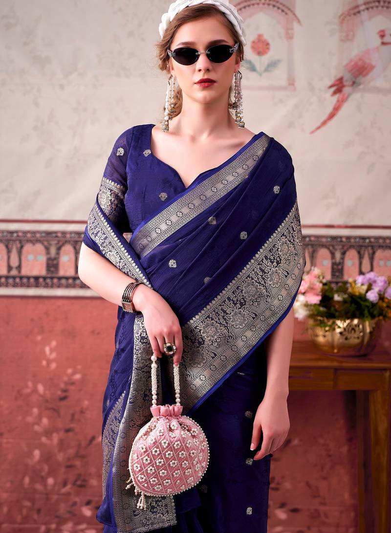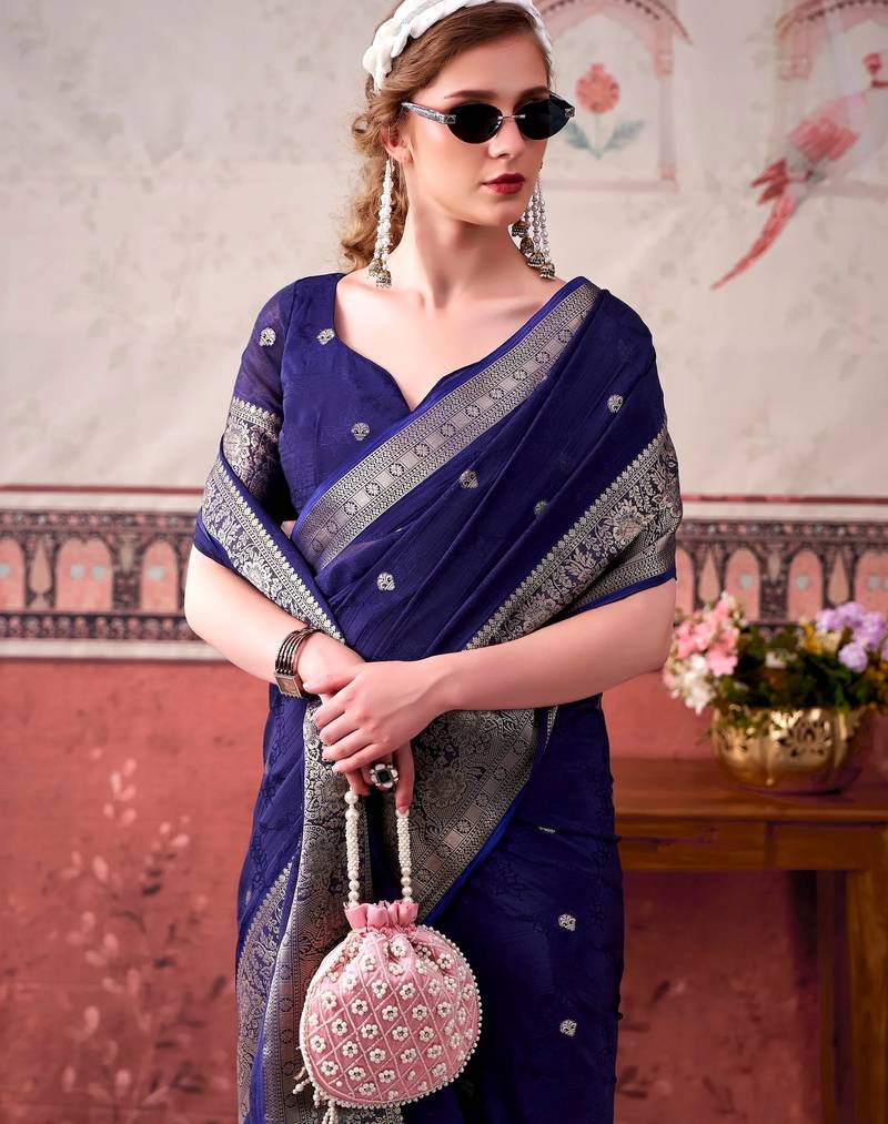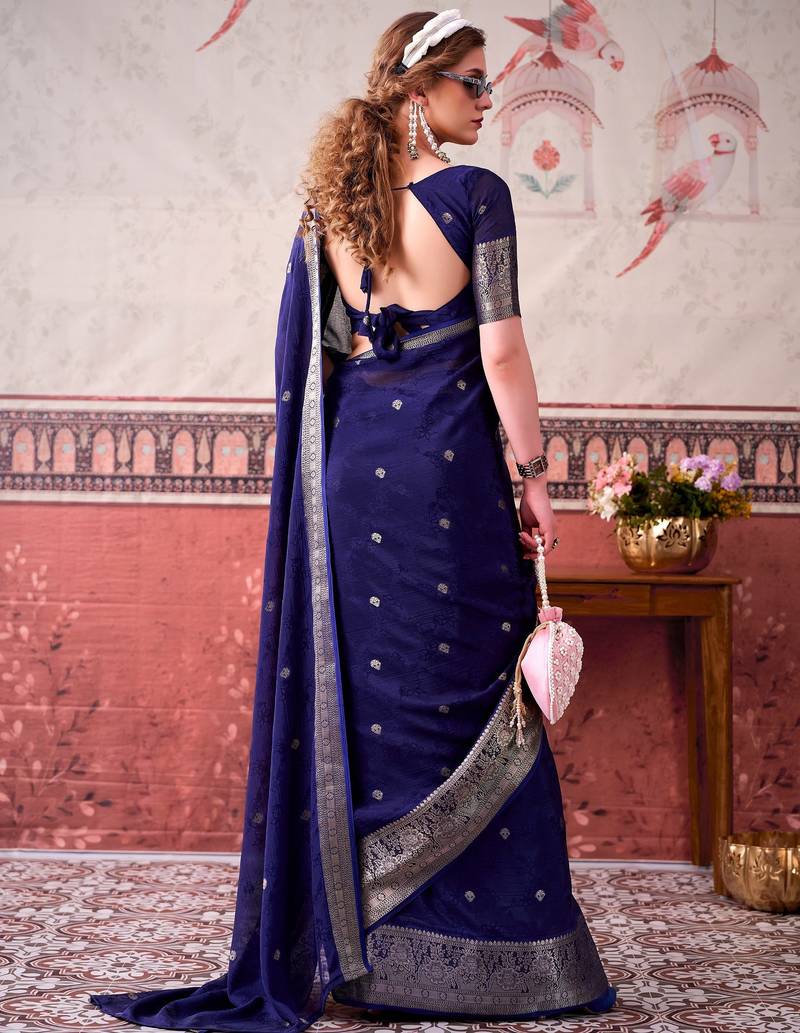 | Product Name | Navy Blue Self Printed Chinnon Silk Zari Weaving Work Saree | |