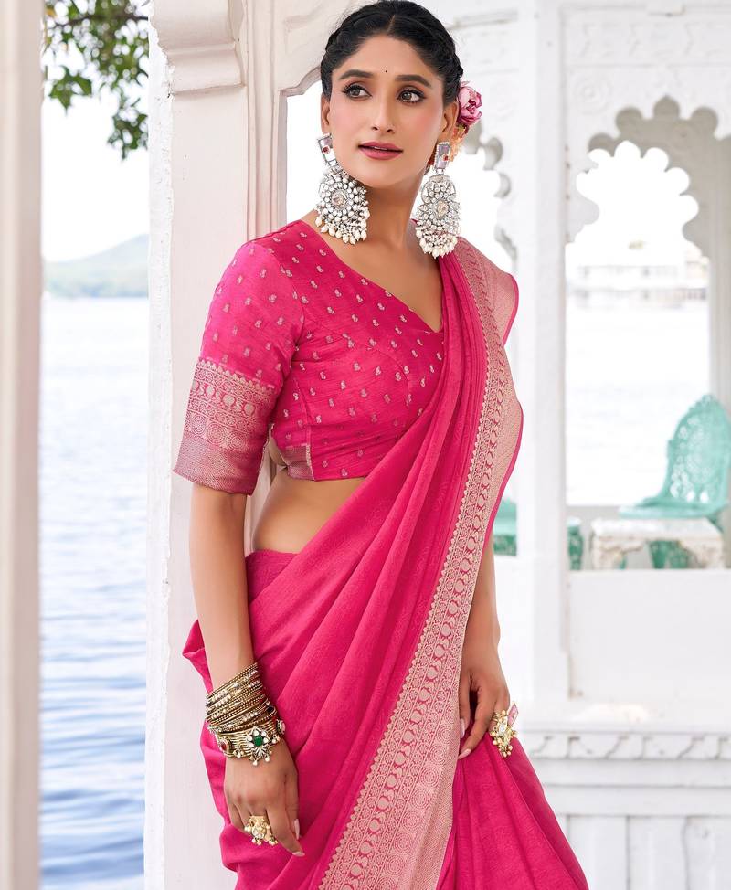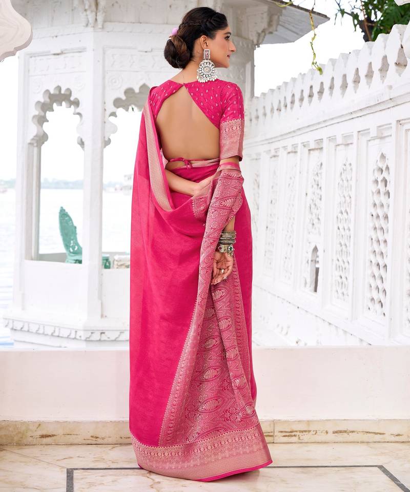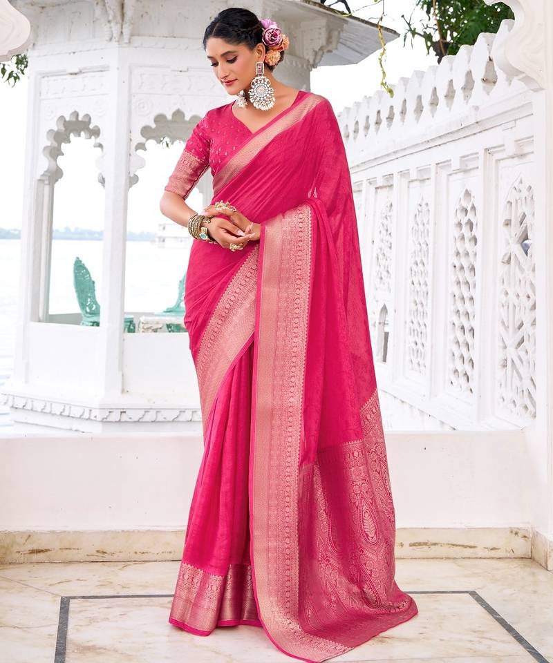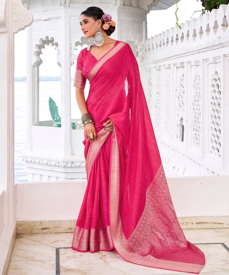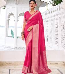 | Product Name | Pink Self Printed Chinnon Silk Zari Weaving Work Saree | |