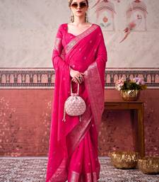 Pink self printed chinnon silk zari weaving work saree