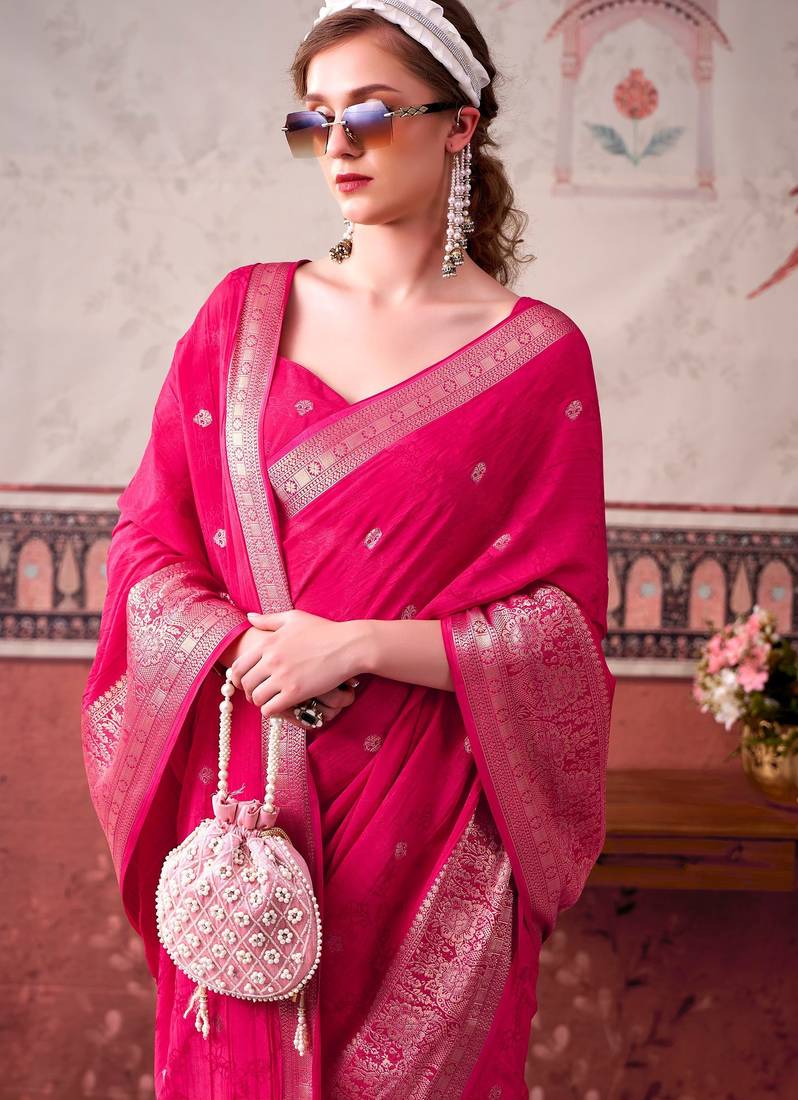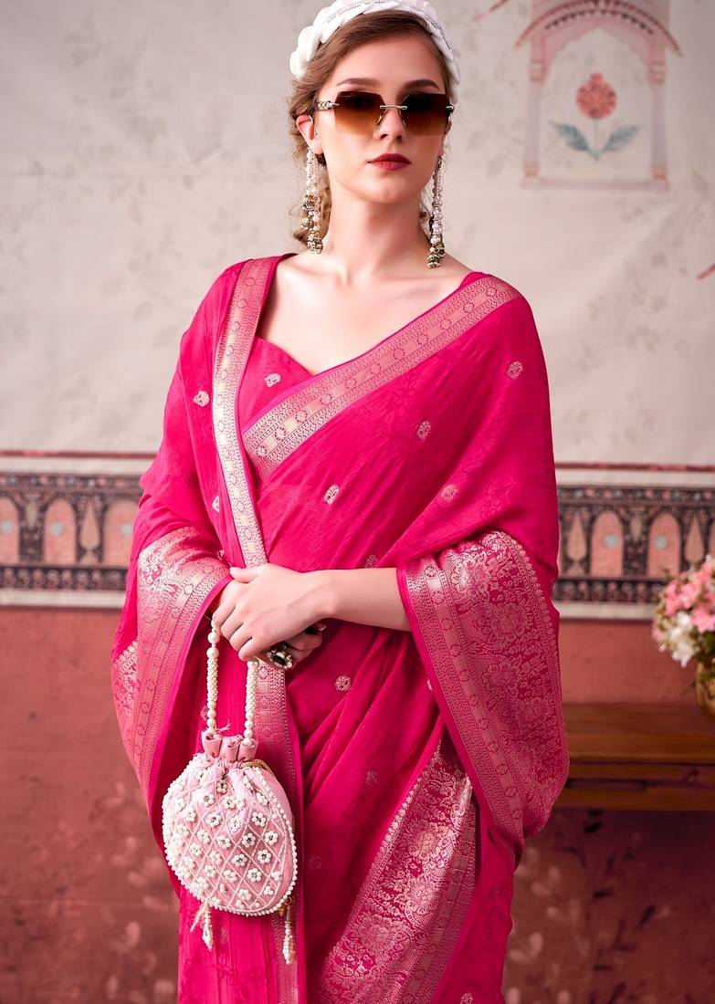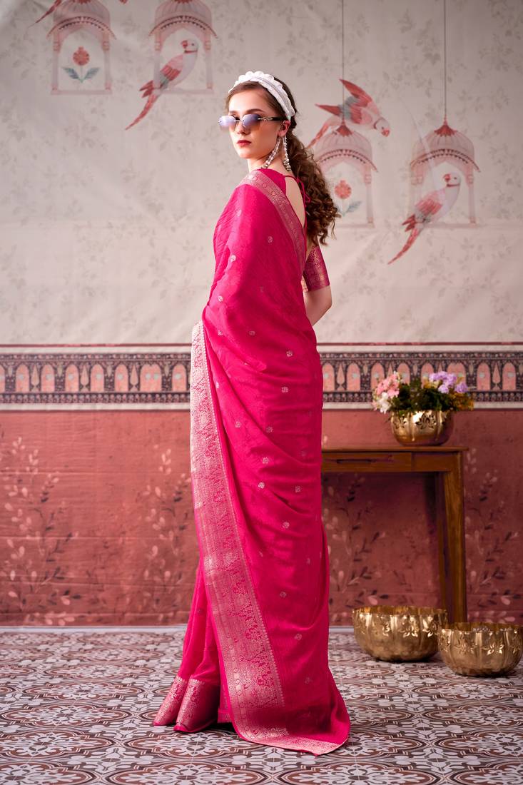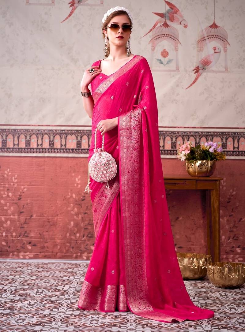 | Product Name | Pink Self Printed Chinnon Silk Zari Weaving Work Saree | |