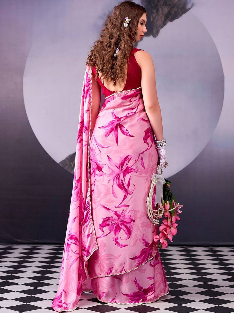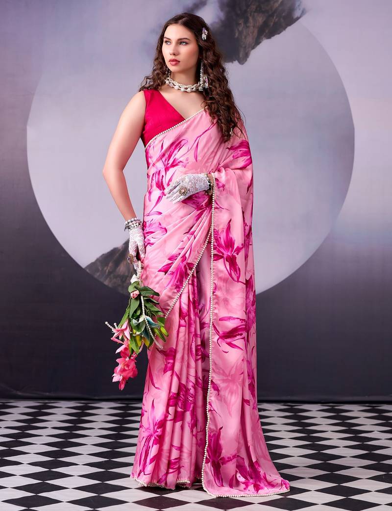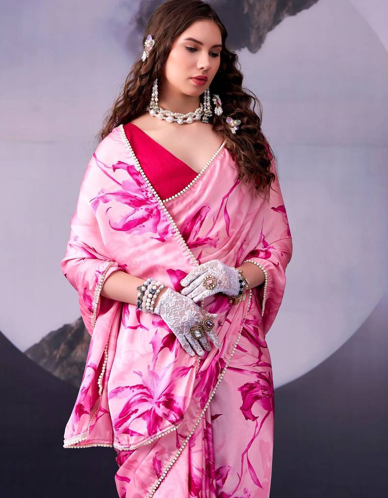 | Product Name | Pink Softness Satin Silk Floral Print With Pearl Lace Border Saree | |