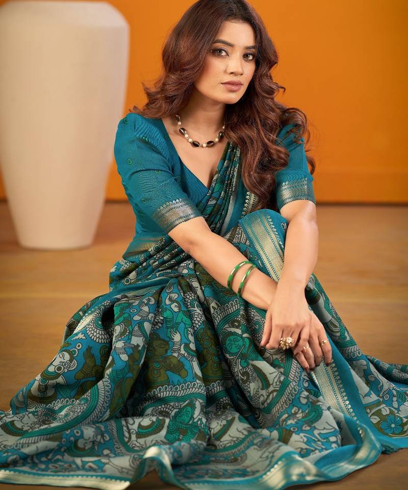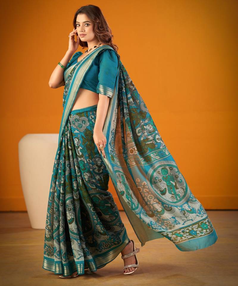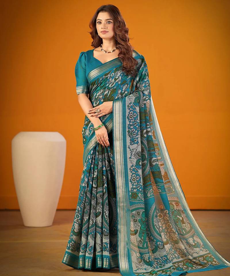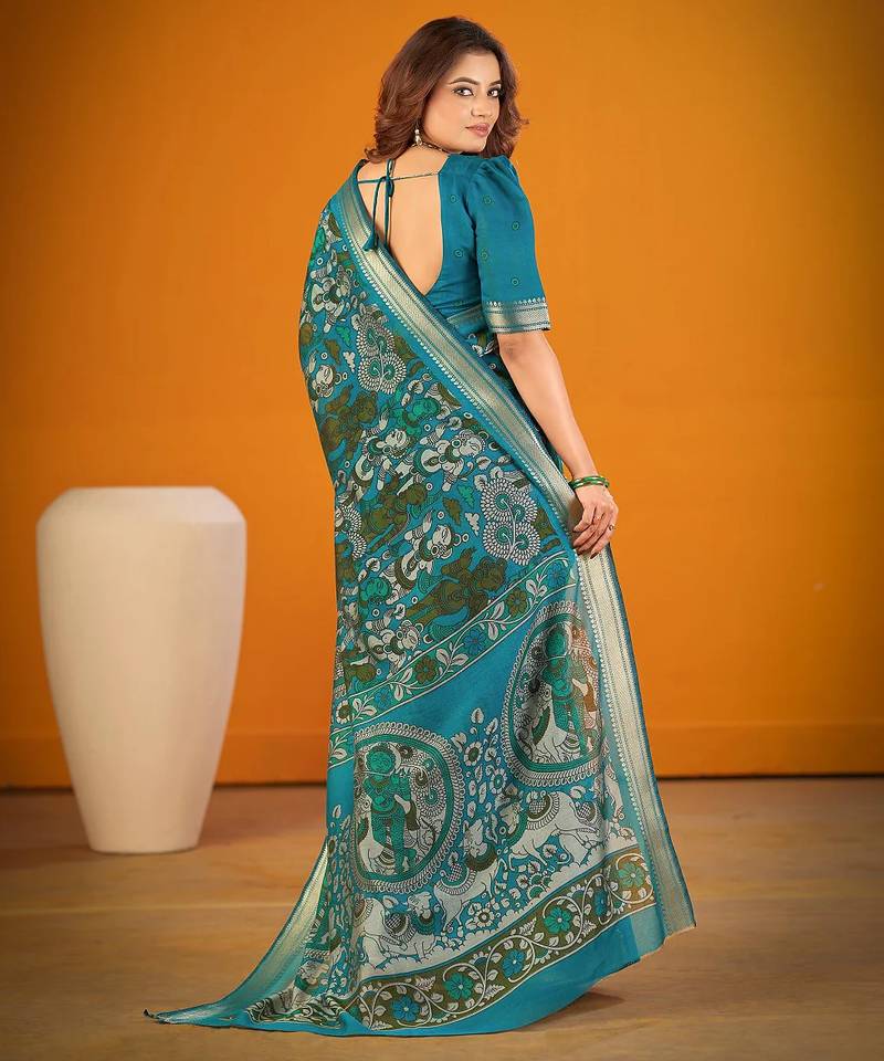 Sea blue viscose chanderi kalamkari print with zari weaving work saree