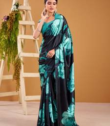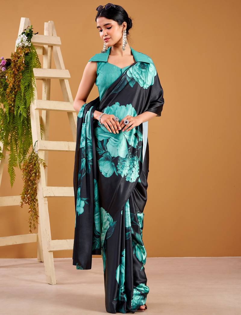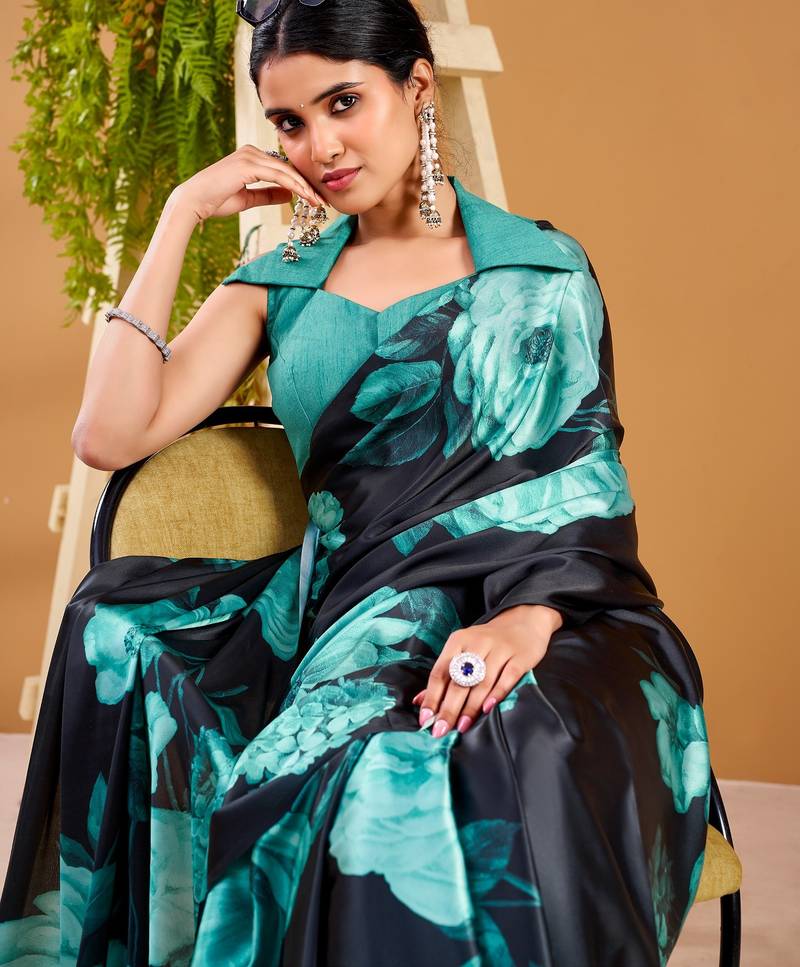 Teal satin silk floral printed smoothness saree