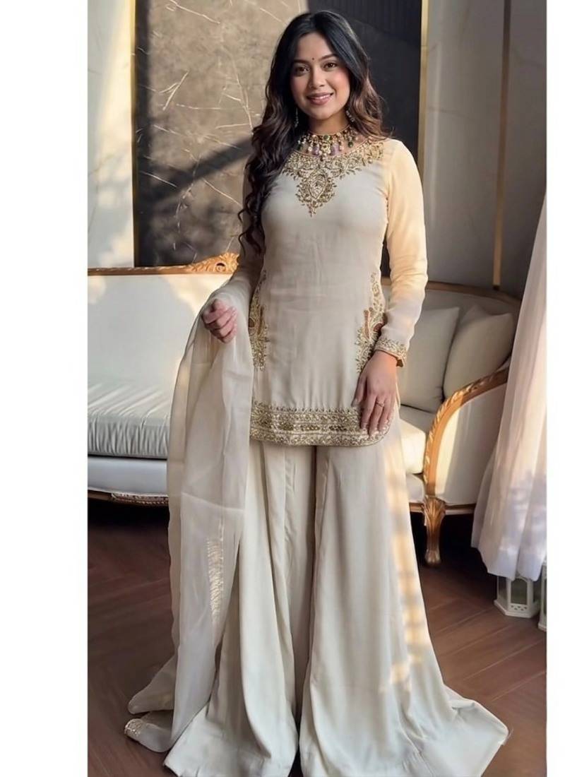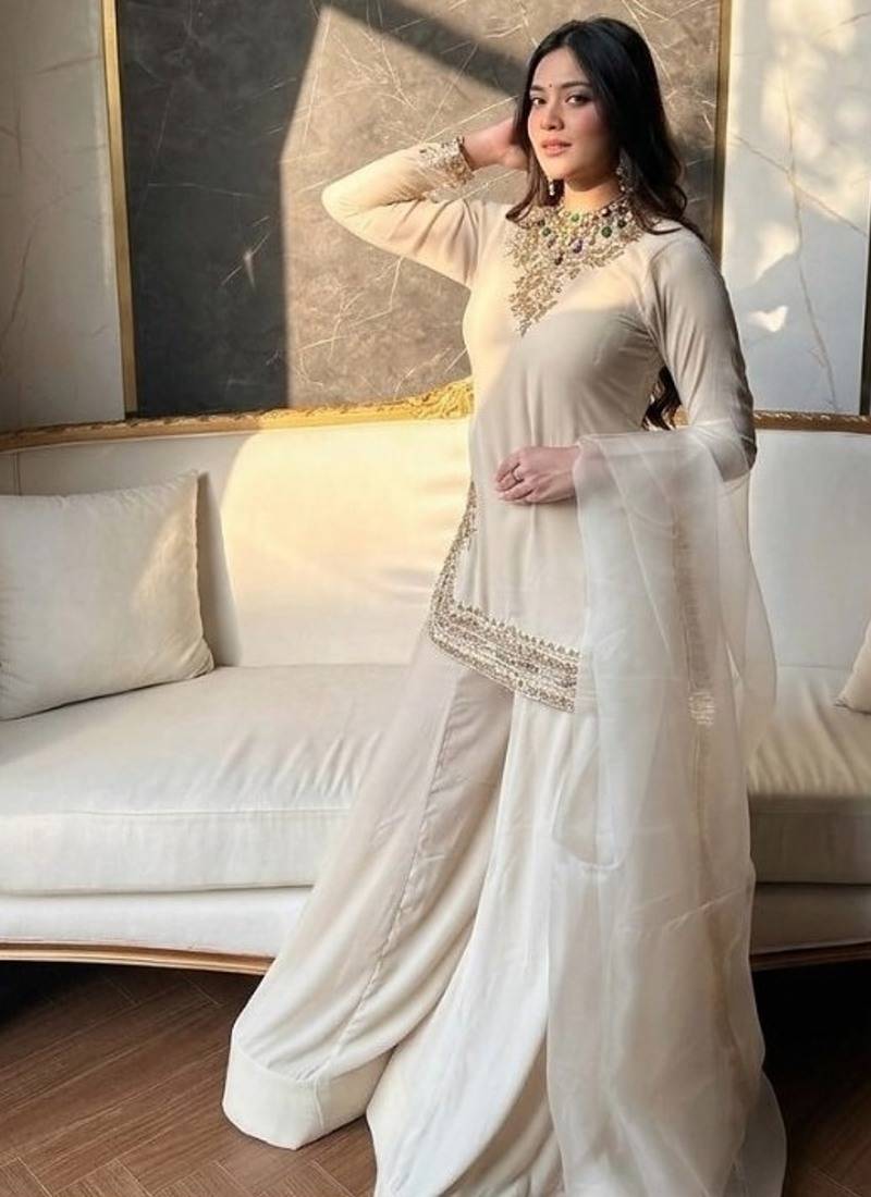 | Product Name | Off White Embroidery Satin Fully Stitched Sarara Plazo Suit Set | |
