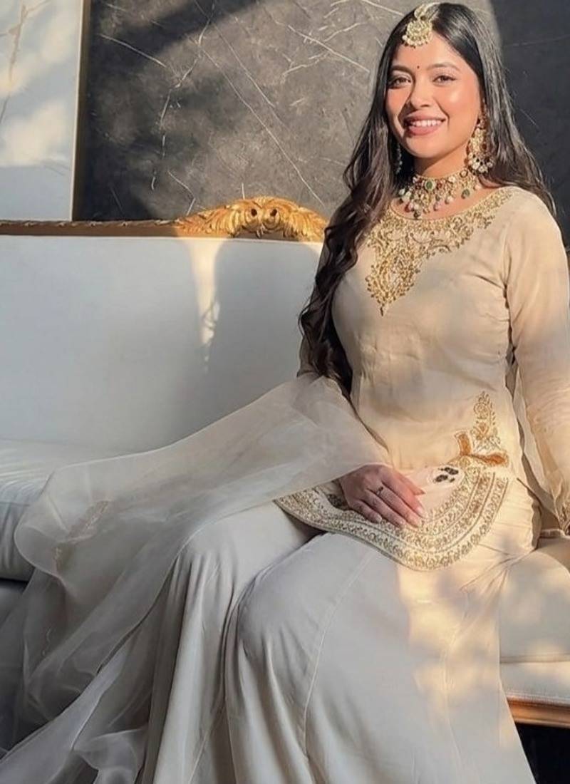 Off-white embroidery satin fully stitched sarara plazo suit set