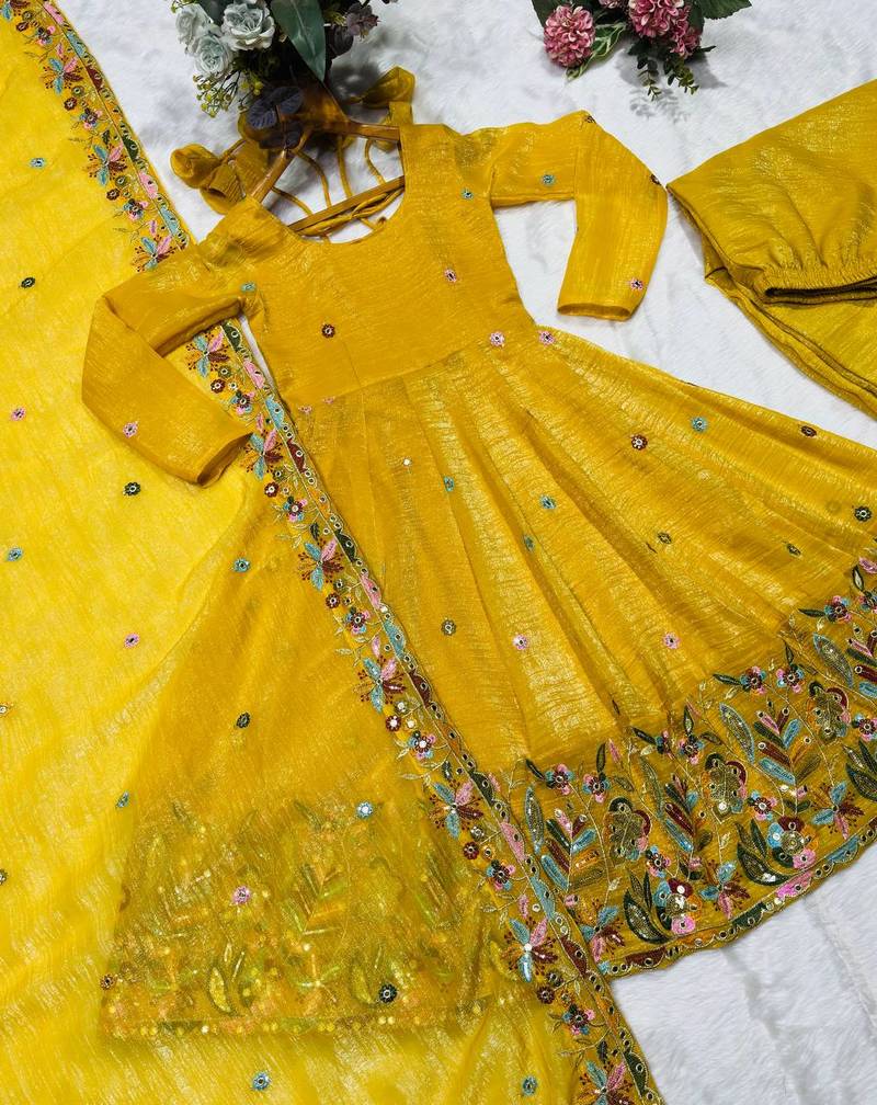 Yellow crunshy silk party wear embroidery sharara suit set stitched